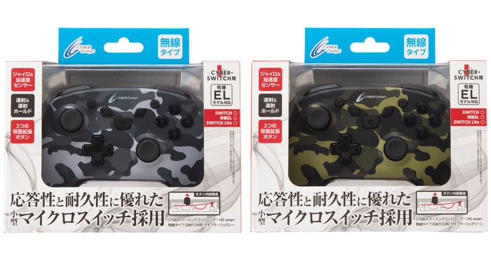 本製品は、ジャイロ&加速度センサーを搭載したSwitch用コントローラーです。十字、ABXY、L/R、ZL/ZRボタンには、軽い力で反応し、応答性と耐久性に優れた小型マイクロスイッチを採用。カチカチとした打感で快適に操作できます。また、背面には2個の拡張ボタンを搭載しており、前面ボタンの機能を割り当てて使用できます。さらに、便利な連射&連射ホールド機能も搭載。Nintendo Switchシリーズのほか、パソコンなどにも対応しています。今回、ご好評いただいている「ブラック」「ブルー」などの既存カラーに加え、新たに「カモフラージュグレー」「カモフラージュグリーン」の2色が発売となります。