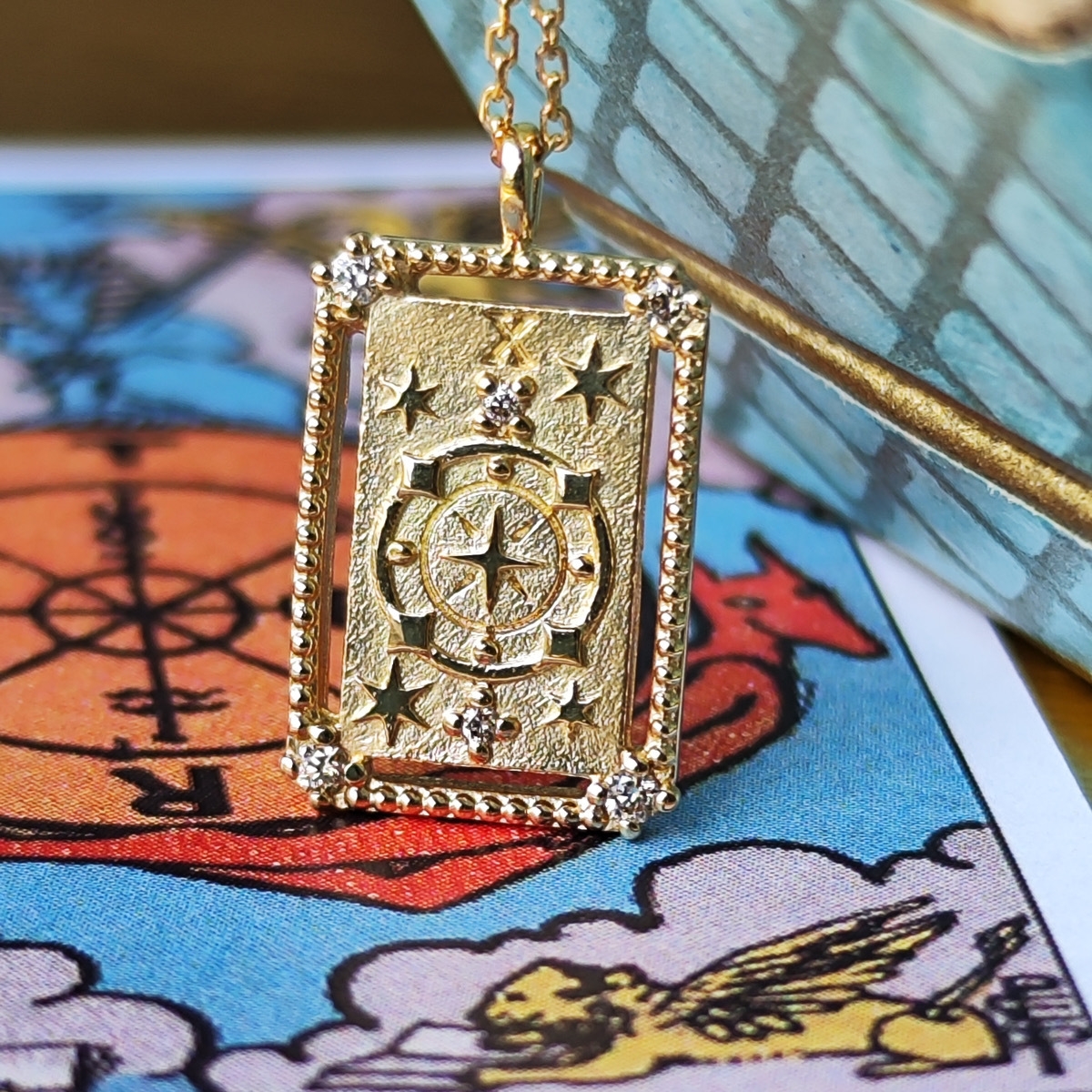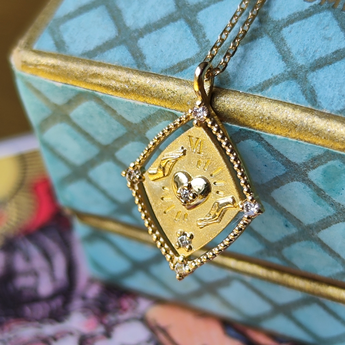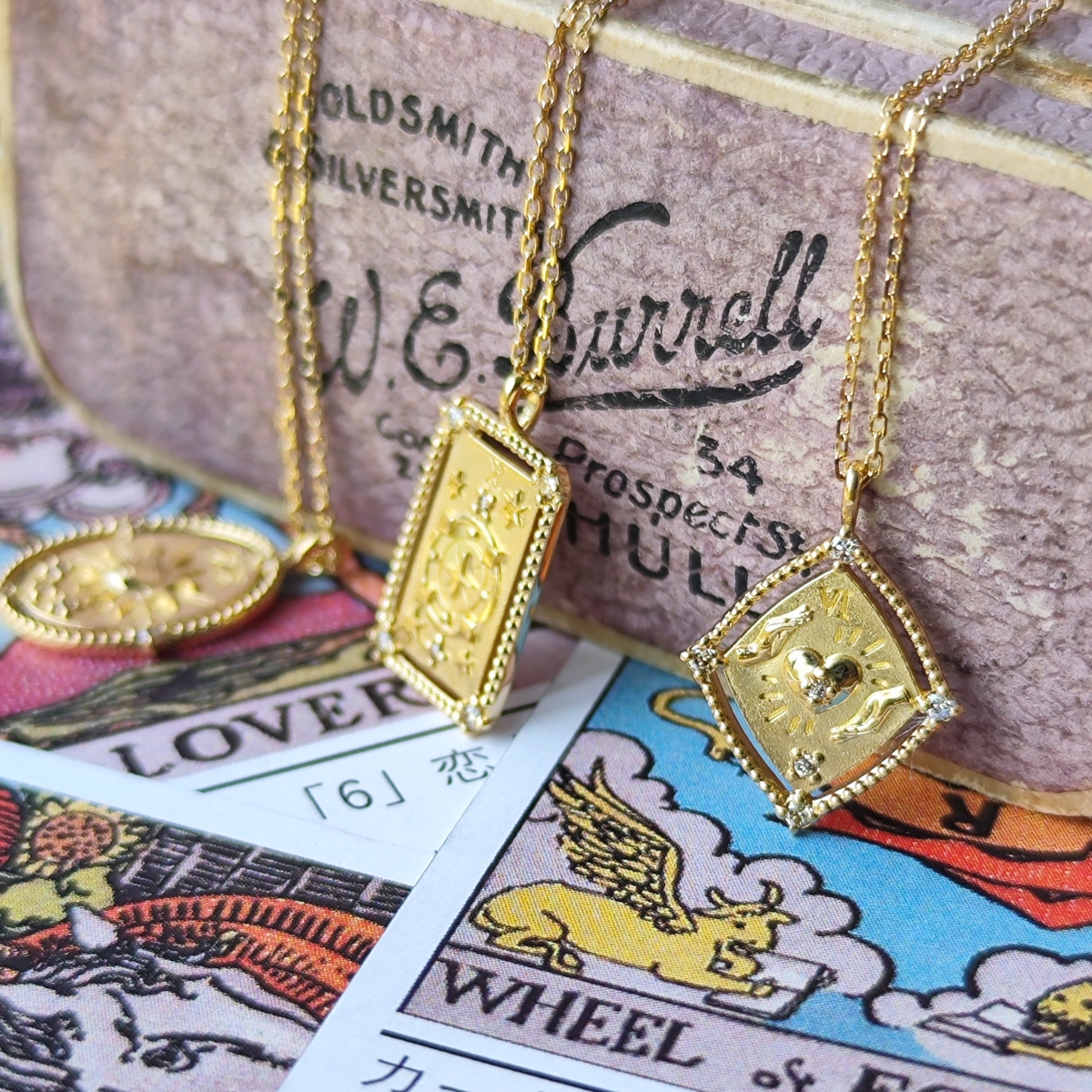 そこで当店では、単なる装飾品としてのジュエリーではなく、持ち主の想いや願いを込めた“パーソナルなシンボル”として、タロットカードの持つ神秘性を融合させた新たなジュエリーを企画。「恋人」・「太陽」・「運命の輪」の3種類のタロットカードをモチーフとしたネックレスをご用意しました。