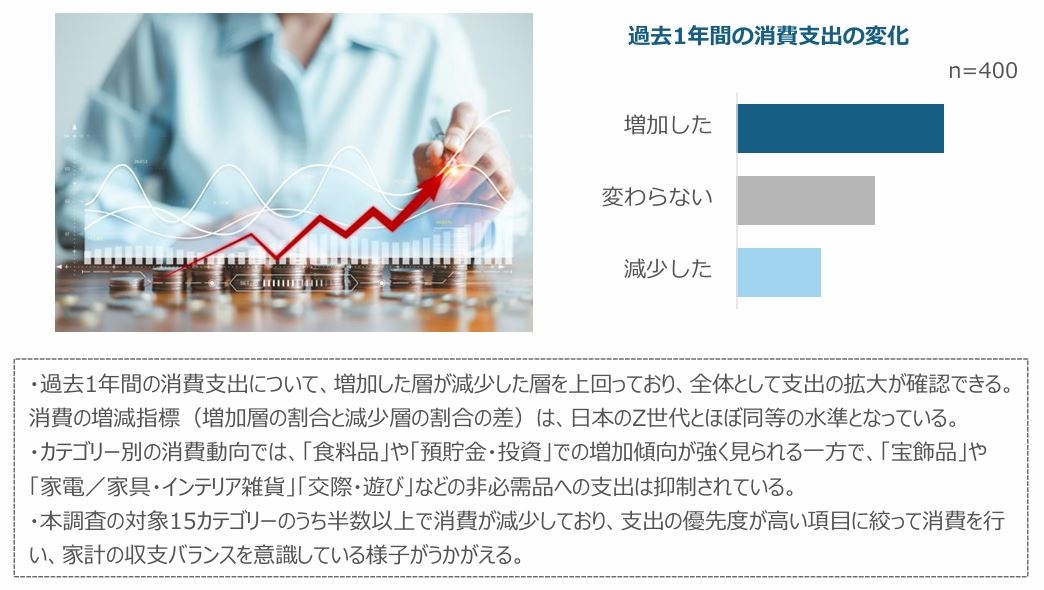 ■過去1年間の消費支出は増加傾向にあり、増加指標は日本のZ世代とほぼ同じ。