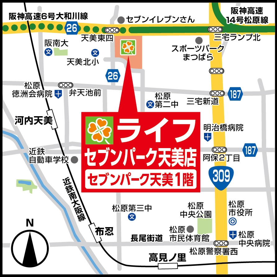 ・当店は、国道309号線・県道12号線・阪神高速「三宅IC」が交わるポイントに位置するショッピングモール「セブンパーク天美」の1階に入店しています。セブン&アイ・クリエイトリンクの手がける大型商業施設に、ライフが初出店いたします。