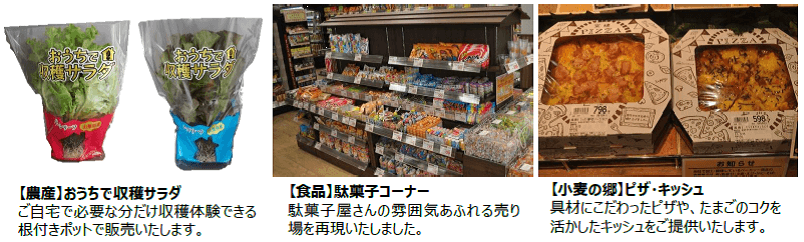 モール型店舗ならではのごちそうメニューや、味も見た目のおいしさもお楽しみいただける新商品を品ぞろえし、当店だけの「限定商品」も登場いたします。また、商品を選びやすくお買い物しやすい売り場を実現するため、サラダと魚惣菜をそれぞれ集合展開するほか、メイン入口に惣菜・手作りパン売り場を配置し、時短ニーズに対応いたします。
