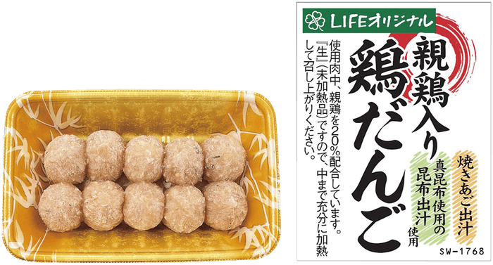親鶏のもも肉・むね肉を配合しており、食感と旨味を楽しむことができ、焼あご出汁の味わい豊かな風味を感じることのできるライフオリジナルの鶏だんご。餃子のタネなど、アレンジしてお召し上がりいただくこともおすすめです。