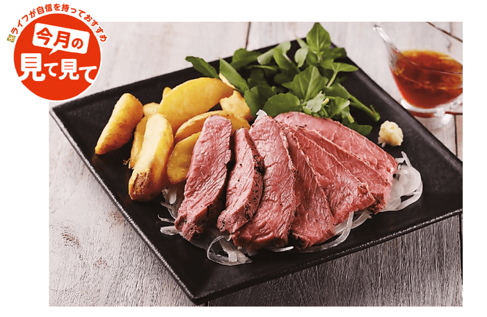 食卓を華やかに彩るメニューとして大活躍するローストビーフ。ライフが自信を持っておすすめする「今月の見て見て」の近畿圏12月商品に選ばれた「ともさんかくのローストビーフステーキ」は、牛一頭からわずかしかとれない「ともさんかく」を使用したローストビーフです。赤身と脂身のバランスが良く、やわらかくジューシーなローストビーフを厚切りにしているので食べ応えも抜群です。