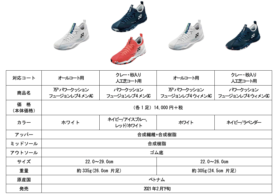ヨネックス株式会社(代表取締役社長:林田草樹)は、新衝撃吸収反発素材「パワークッション®プラス」を搭載し、足を包み込む新設計パーツ「フュージョンウイング」採用によりフィット性を高めたテニスシューズ「POWER CUSHION FUSIONREV 4」を2021年2月下旬より発売いたします。