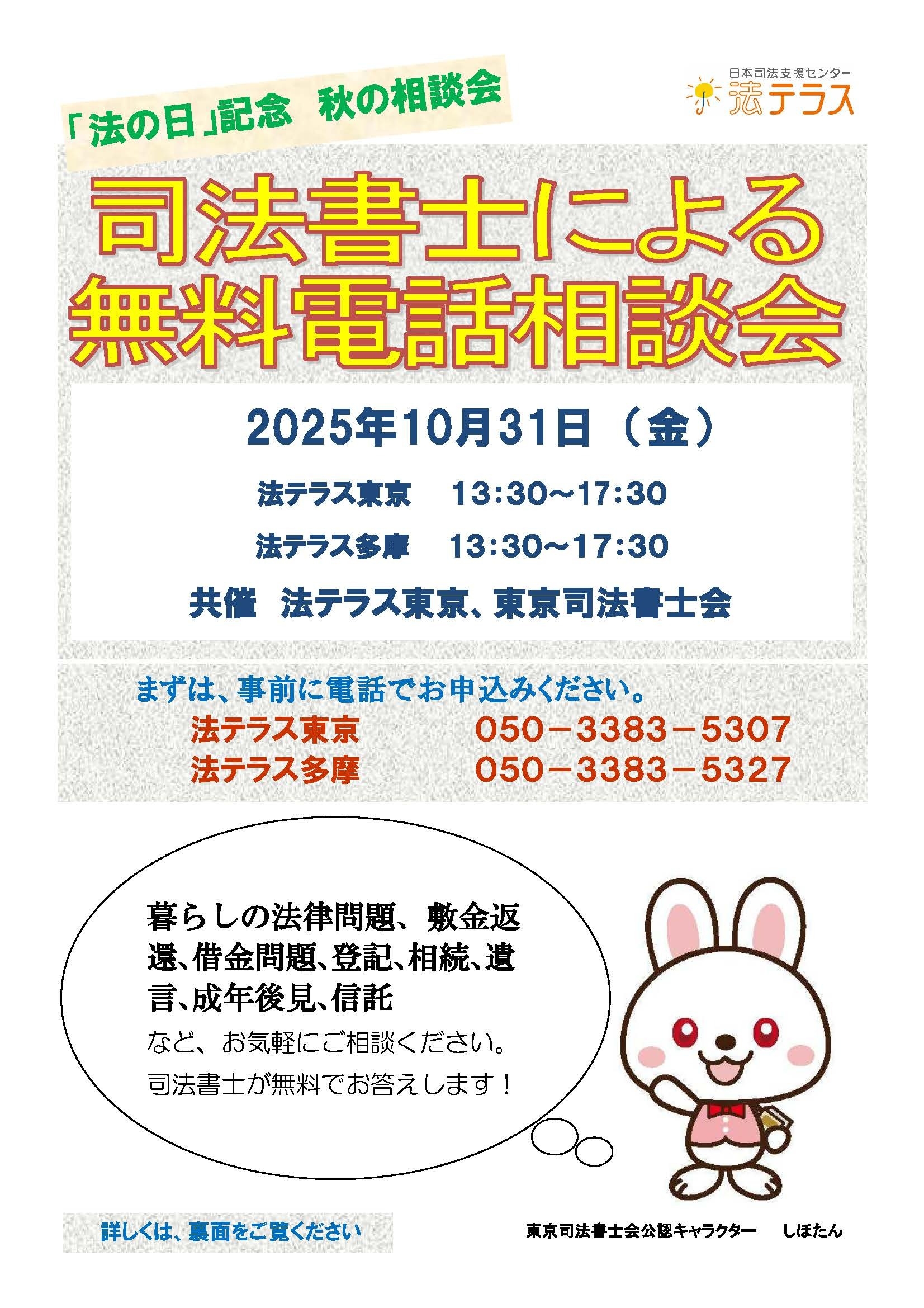 日本司法支援センター東京地方事務所は、「法の日」記念 司法書士による無料電話相談会を開催いたします。