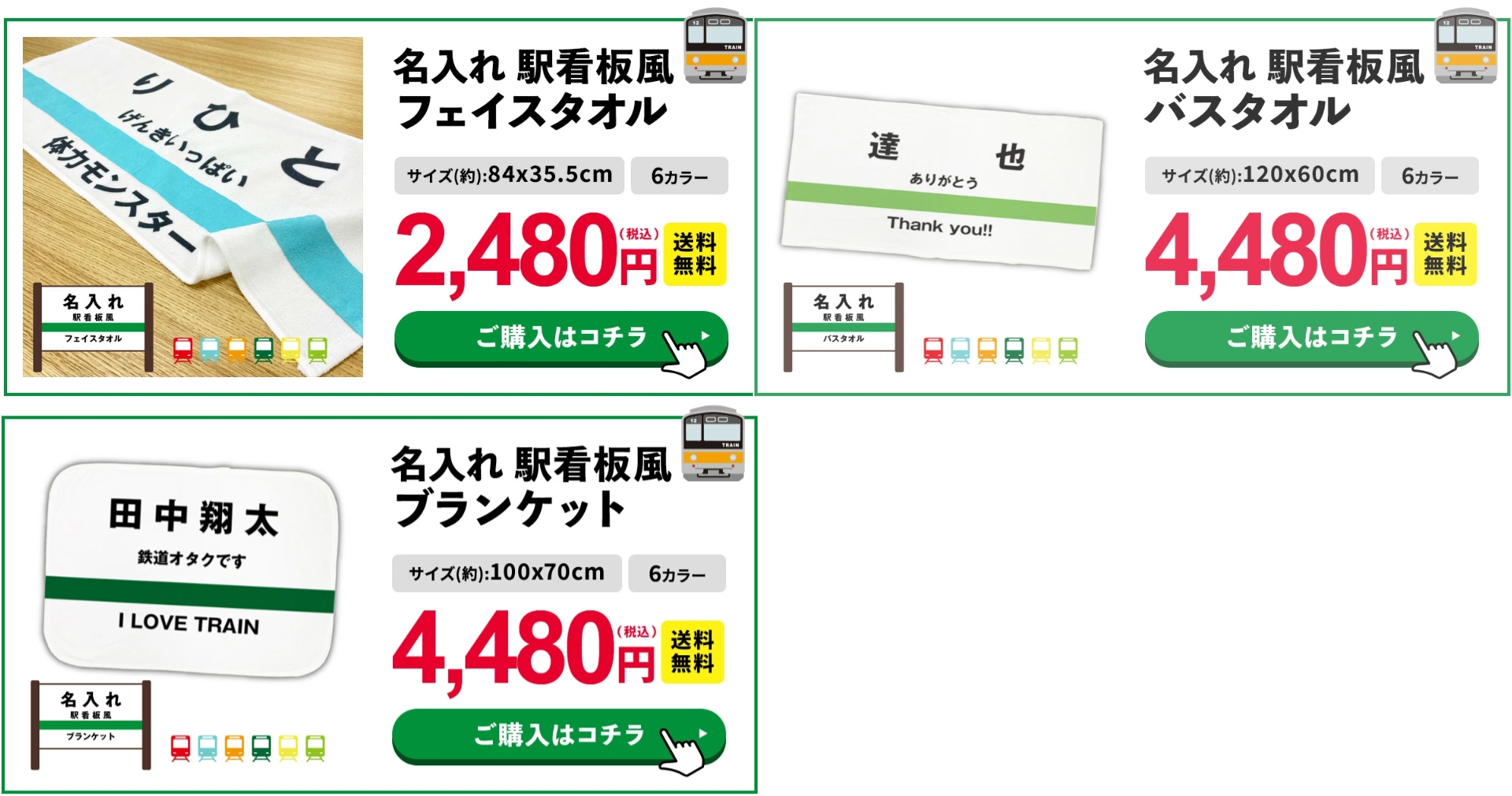 駅看板風シリーズでは、フェイスタオル、バスタオル、ブランケットなど、駅看板風のデザインに名入れができる商品をご用意しています。これらの商品は、楽天市場の”俺流総本家”にて通常価格2,480円~のところ、10%OFFクーポン使用で2,232円~で販売いたします。