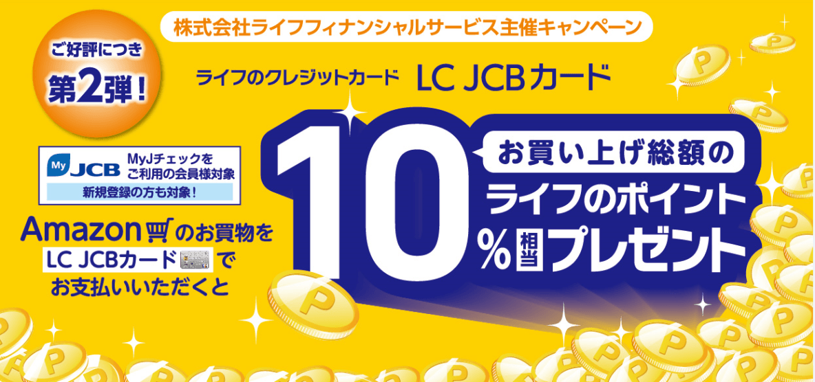 MyJチェックにご登録の上、Amazonのお買い物で「LC JCBカード」をご利用いただくと、もれなくお買い上げ総額の10%相当のライフのポイントを進呈します。