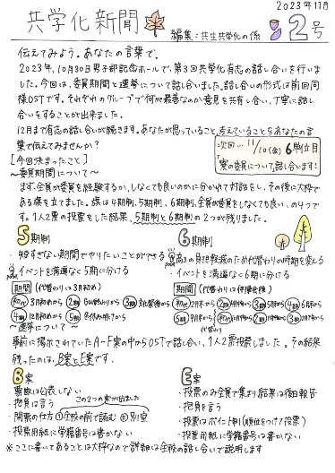 同キャンパスで、それぞれの運営を行ってきた女子部と男子部が統合するにあたり、生徒たちが話し合ってきたテーマは、「校舎」「制服」「委員(生徒会)の役割や選挙の方法」「中高のつながり」など、多岐にわたります。ファシリテーションも学びながら自分たちで行うようになり、話し合いの経緯をまとめた「共学化新聞」を全校生徒が見られる廊下やトイレに掲示して、進捗状況を随時共有しています。