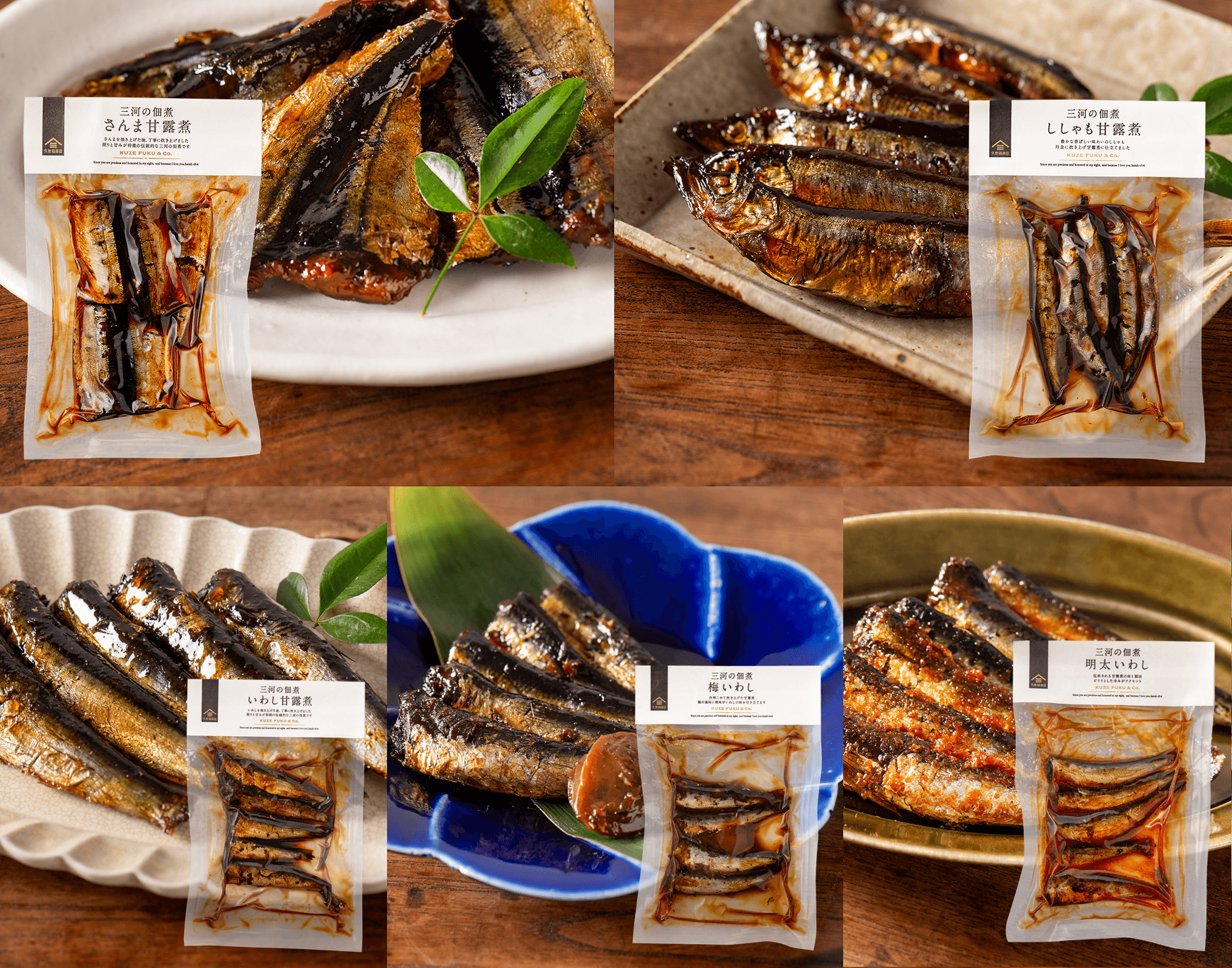 三河の佃煮シリーズは、その名の通り愛知県の三河地方で作られた魚の佃煮です。もともと三河湾一帯は海産物も砂糖も豊富であり、醤油やみりんに恵まれた場所でした。まさに佃煮を製造するのに最適な場所ということもあり、こうした背景から三河地方では佃煮が名産品として根付いたといわれています。