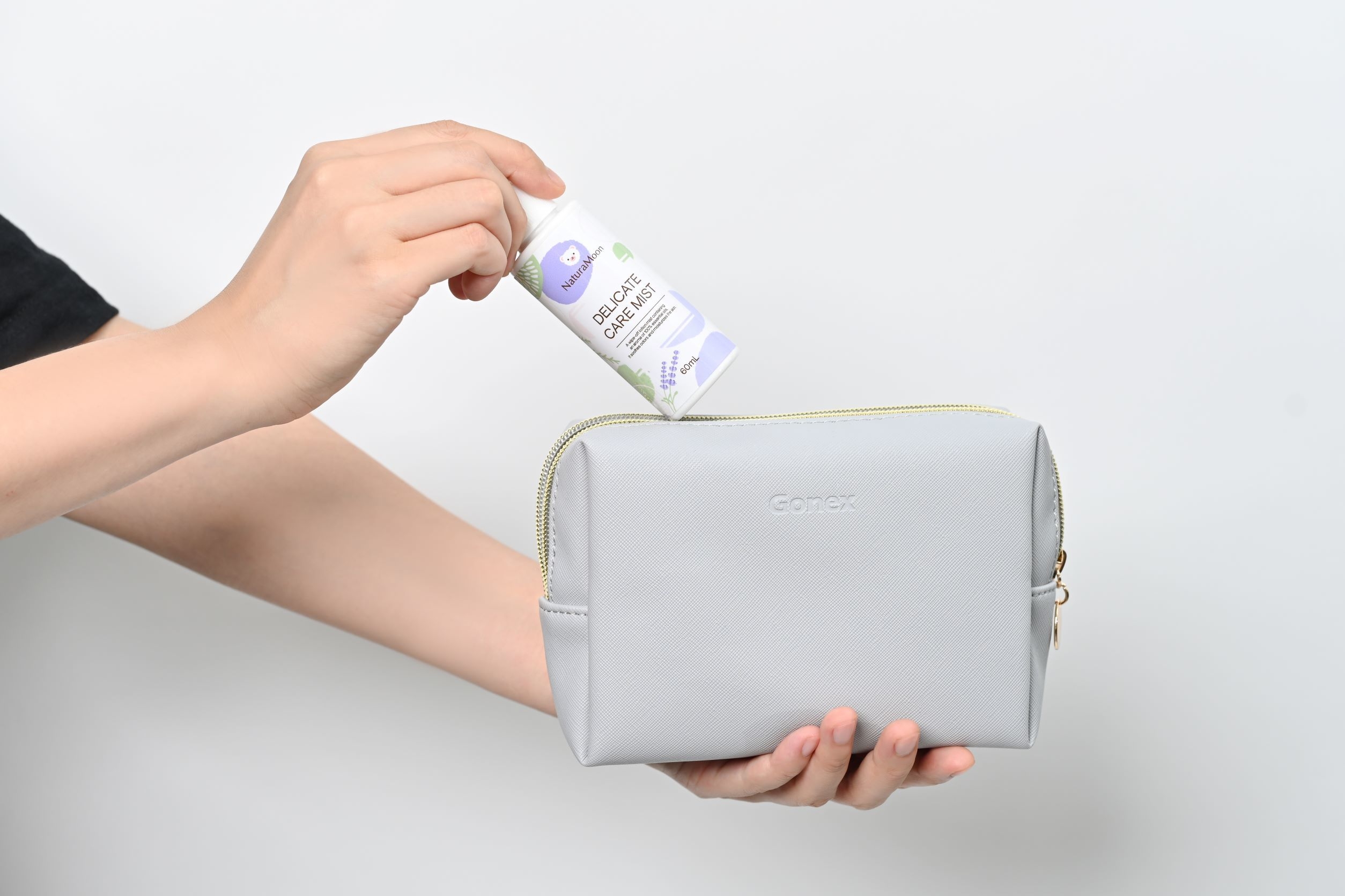 「外出先でも気になるときにすぐに使いたい」「持ち運びの負担は減らしたい」という要望に応え、携帯しやすい60mlサイズを採用。ポーチにもすっぽり収まるので、持ち運びも楽です。