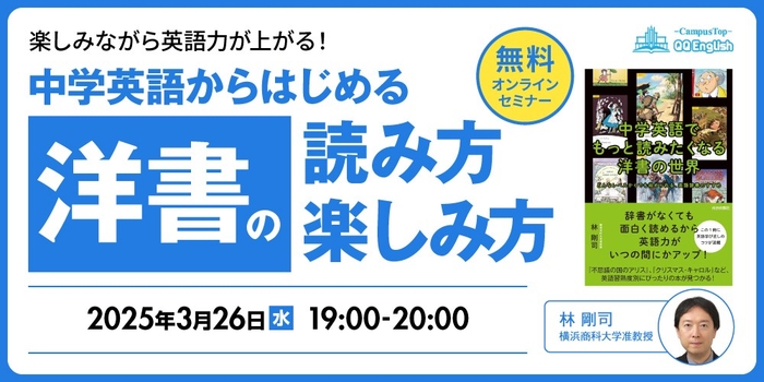 株式会社QQEnglish(本社:東京都渋谷区、代表取締役:藤岡頼光、以下QQEnglish)は、2025年3月26日(水)19時から横浜商科大学准教授の林剛司さんをお招きして、「中学英語からはじめる 洋書の読み方・楽しみ方」について、無料オンラインセミナーを実施することをお知らせいたします。