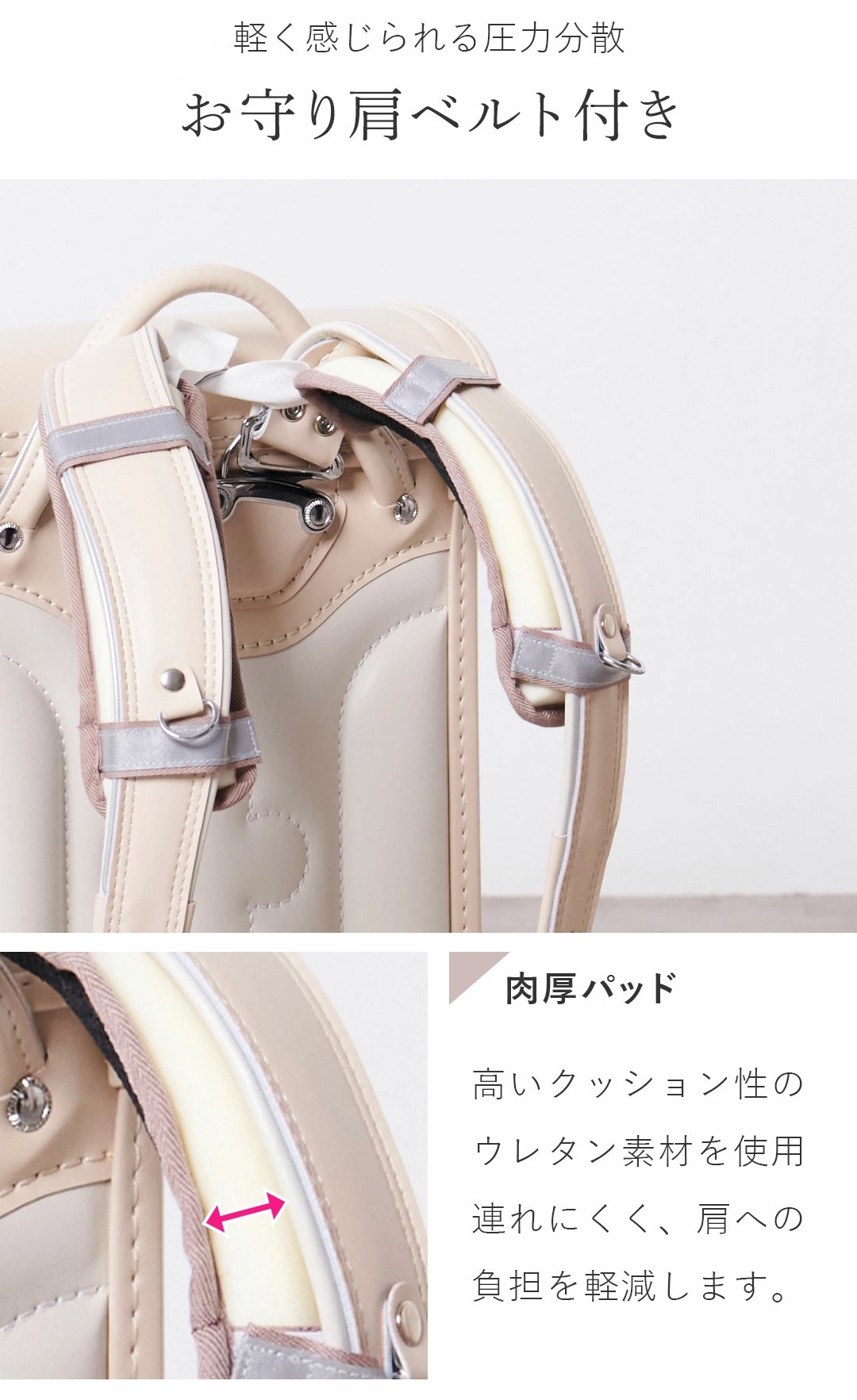 近年、教科書満載で小学校低学年体重の4分の1近くの重さからくる「ランドセル重い!」問題による「ランドセル症候群」、「小学生整体」などの社会問題を解消できればという思いから、少しでも重さを分散し、軽く感じられるように柔道整復師、アスレティックトレーナー、針灸師先生の監修による、ランドセルにぴったりな低反発クッション肩ベルトを開発しました。低反発肩ベルト付きのランドセルは重みによる肩への圧力分散ができ、姿勢を正しく、背負いやすくなります。