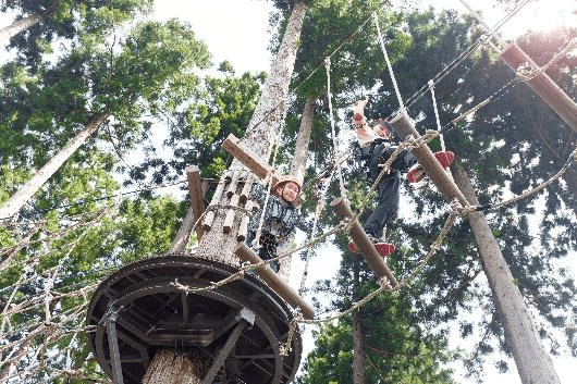 世界基準の安全装備を身につけ、木から木へとロープなどを伝って移動し、最後は爽快なジップラインでランディングします。