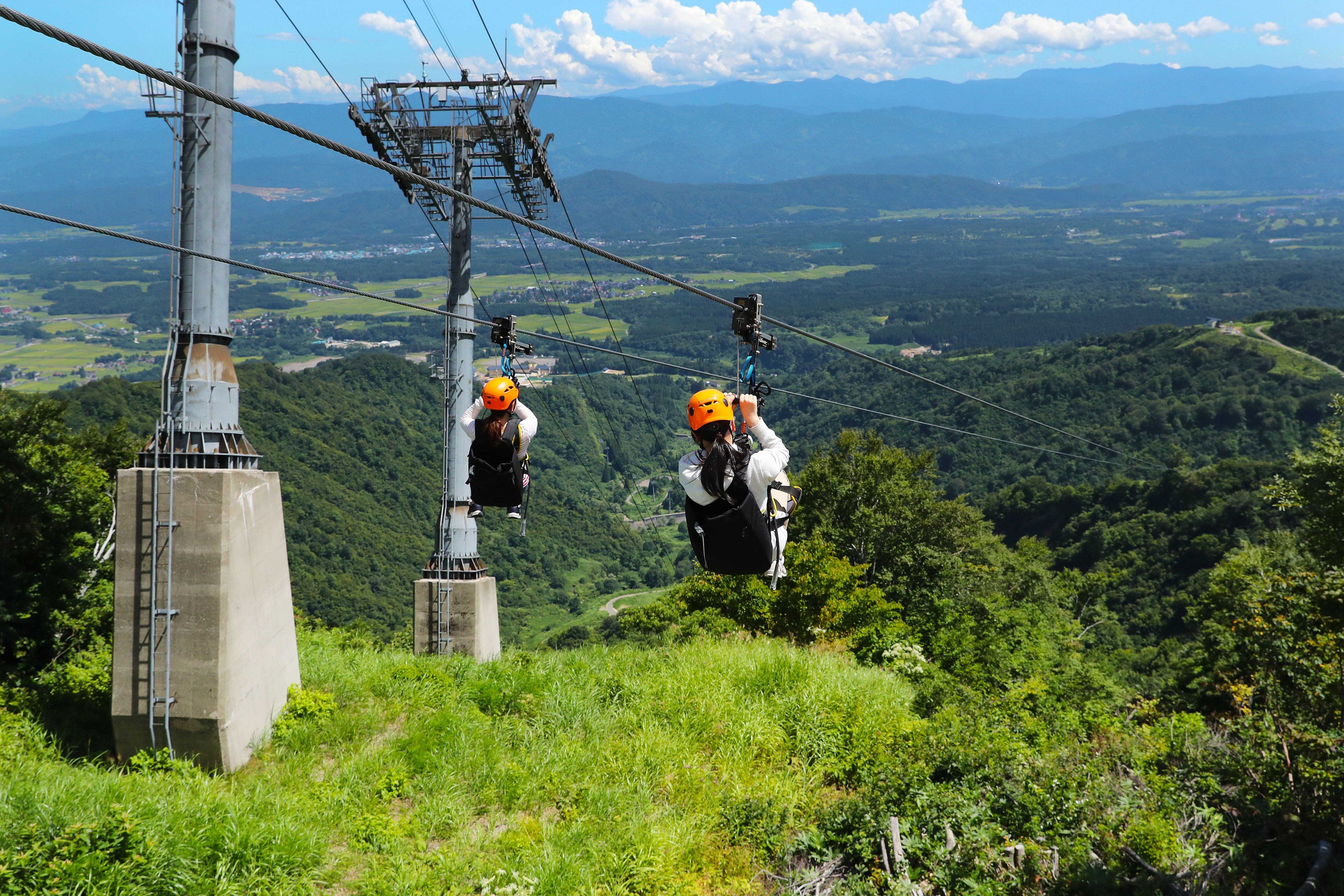 ロッテアライリゾートのジップツアーは標高950mのスタート地点から一気に全長1,501mを下り降ります。その高低差はなんと240m!最高時速は80kmを超え、妙高の空を駆け抜ける体験が味わえます。