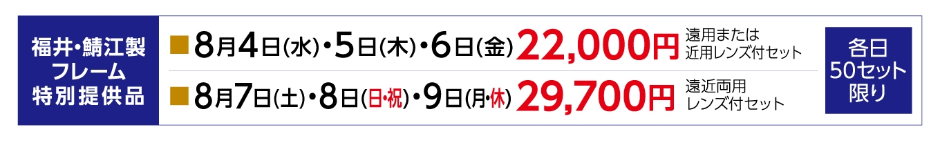 福井・鯖江製フレーム+レンズセットを大変お買得な価格にて、日替わり各日限定50セット限りでご用意いたします。