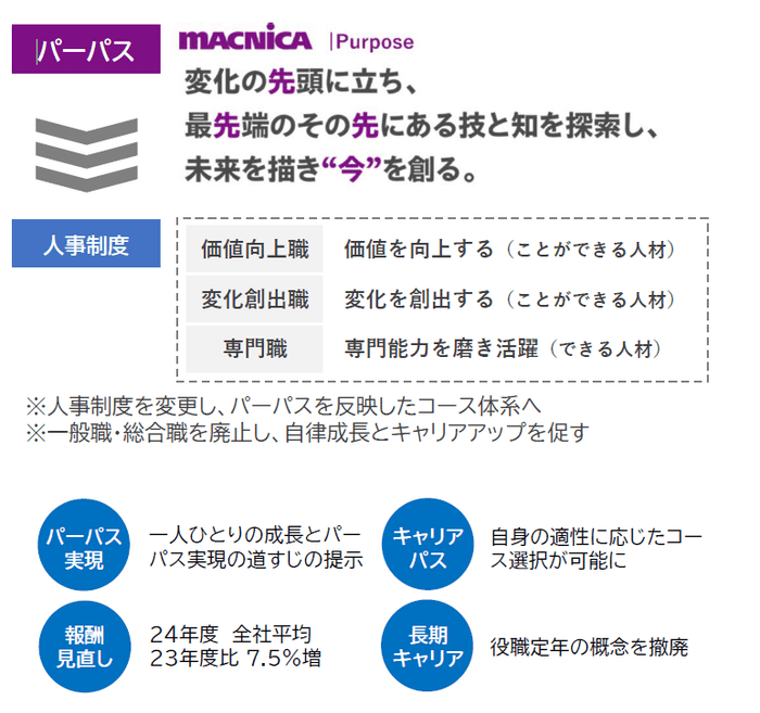 マクニカでは社員一人ひとりの働きがい・成長を追求するとともに、パーパスや将来ビジョンの実現に向け、ベクトルを一つにし、真に競争力の高い会社を目指しています。社員の自律的な成長・キャリアオーナーシップを支える人事施策として、以下2つを掲げています。