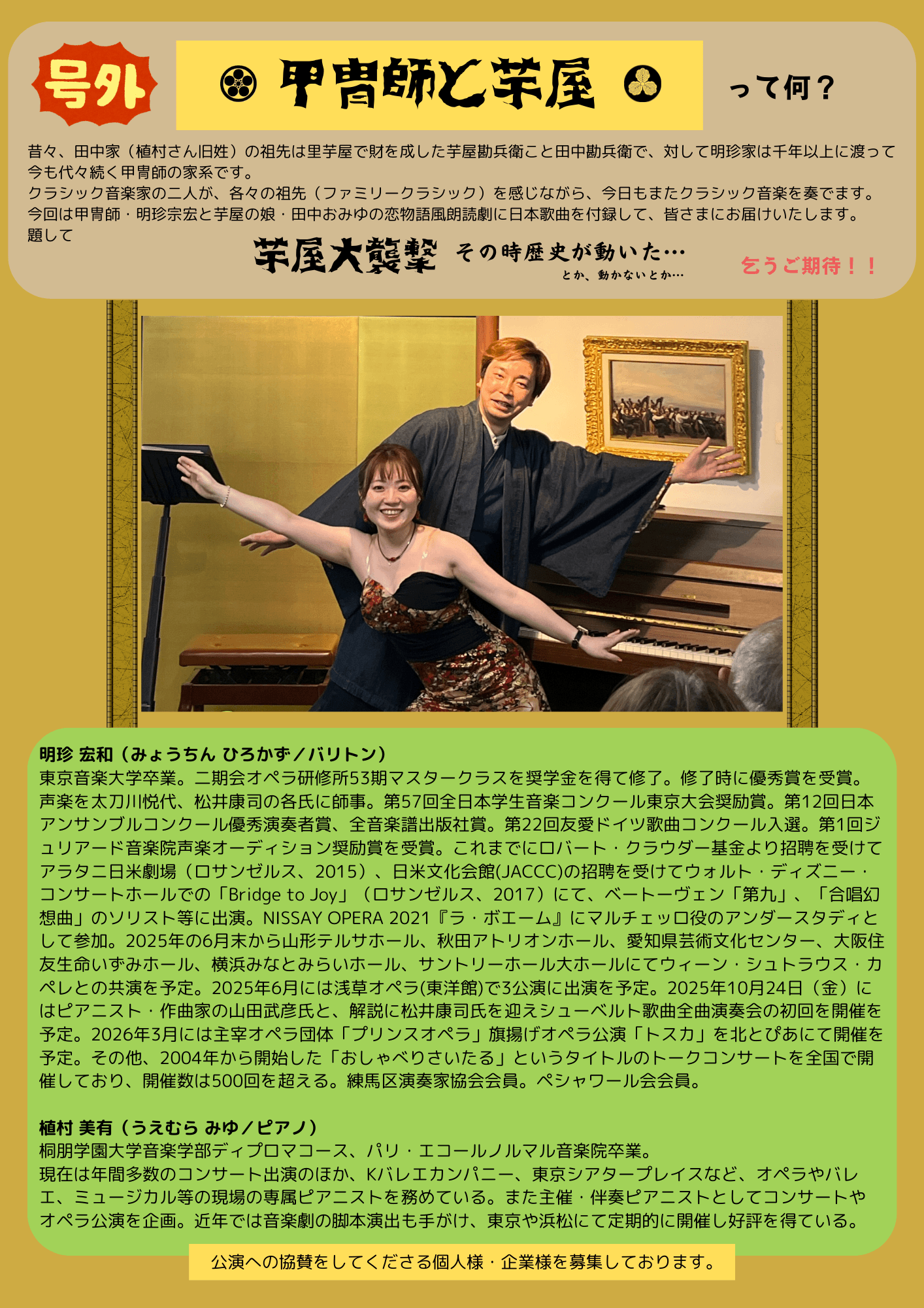 今回は甲冑師・明珍宗宏と芋屋の娘・田中おみゆの恋物語風音楽劇に日本歌曲を付録して、皆さまにお届けいたします。