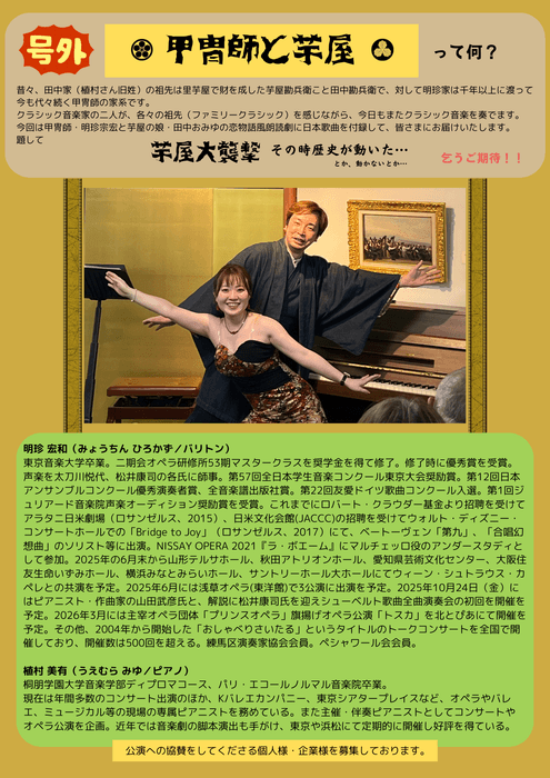 バリトン歌手・明珍宏和 50席限定のオペラコンサートシリーズ 日本歌曲で贈る時代音楽劇「甲冑師と芋屋」上演決定