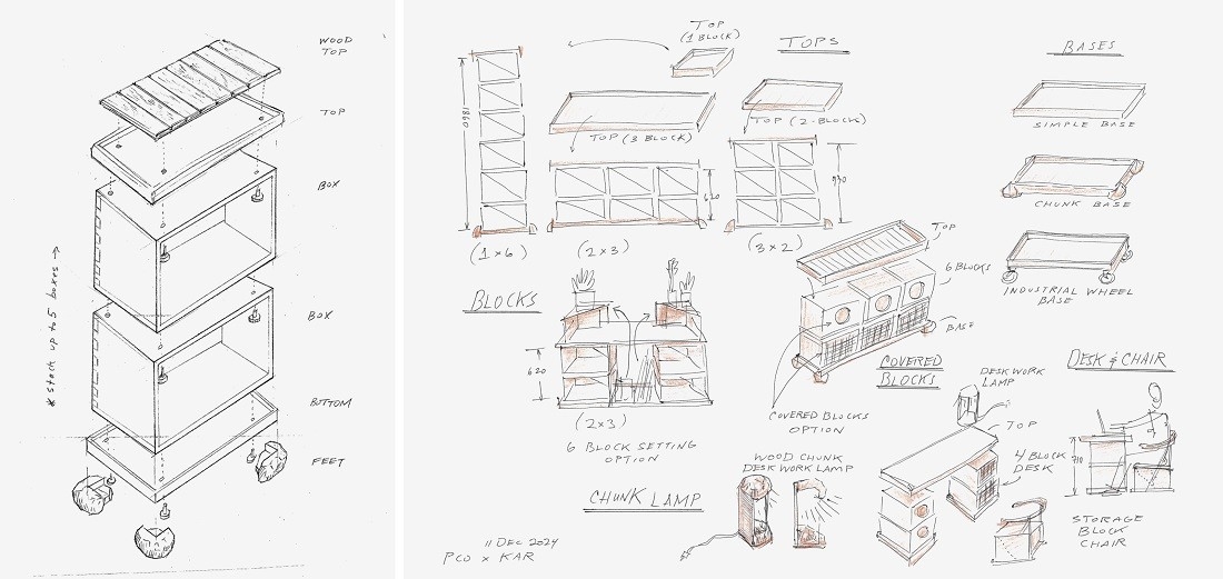 「STAKKO」は、その名の通りstacking(積み重ねる)と言う考え方を基に、『Survey 02: TIMELESS CHANGE』のコンセプトと呼応する形で、ポスタルコと当社が共同で制作した新たな家具の提案です。マイク・エーブルソンが家具のデザインを担当し、エーブルソン友理が名称やロゴを考案したこのSTAKKOは、箱型のひとつのブロックを起点に、棚、椅子、テーブル、ソファなどへと自由にトランスフォームができるモジュラーシステムを採用。無限のバリエーションを生み出しながら、生活の変化に寄り添い、進化し続ける家具です。人の暮らしは、住まい、仕事、興味や価値観の変化によって、日々大きく移り変わります。そのたびにインテリアを一新するのではなく、家具そのものが次の暮らしへと適応し、持ち運ばれていく。時と共に深みを増す木の質感や、使い込まれることで刻まれる傷や思い出が、未来へと繋がっていく。STAKKOは、そんな時間の積み重なりを受け止める器としても存在します。