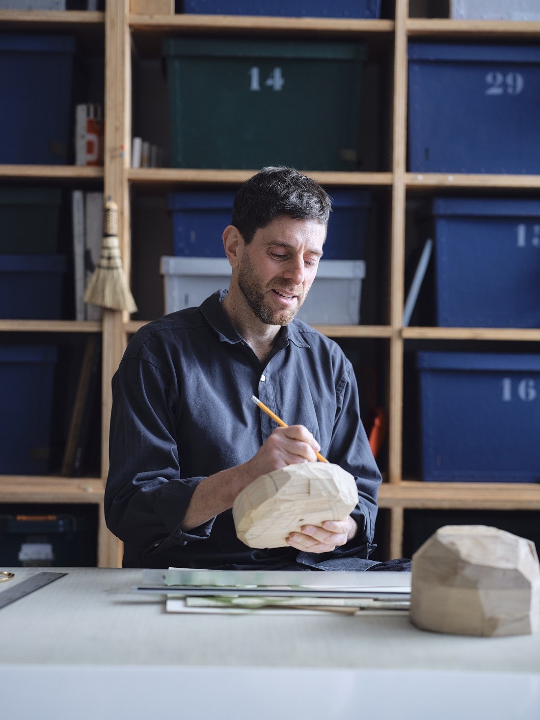 また、ロゴマークにも採用されている幾何学的な立体形状Chunkは、家具の角や引き手など、人の手が自然と触れる位置に誂えられています。高さの調節など、生活をサポートするだけでなく、何気なく触れた時に感じる木の質感や温もり。日本の森林から生まれたChunkは、使い手の手に天然素材の優しさを思い起こさせ、空間に穏やかな時間をもたらすでしょう。