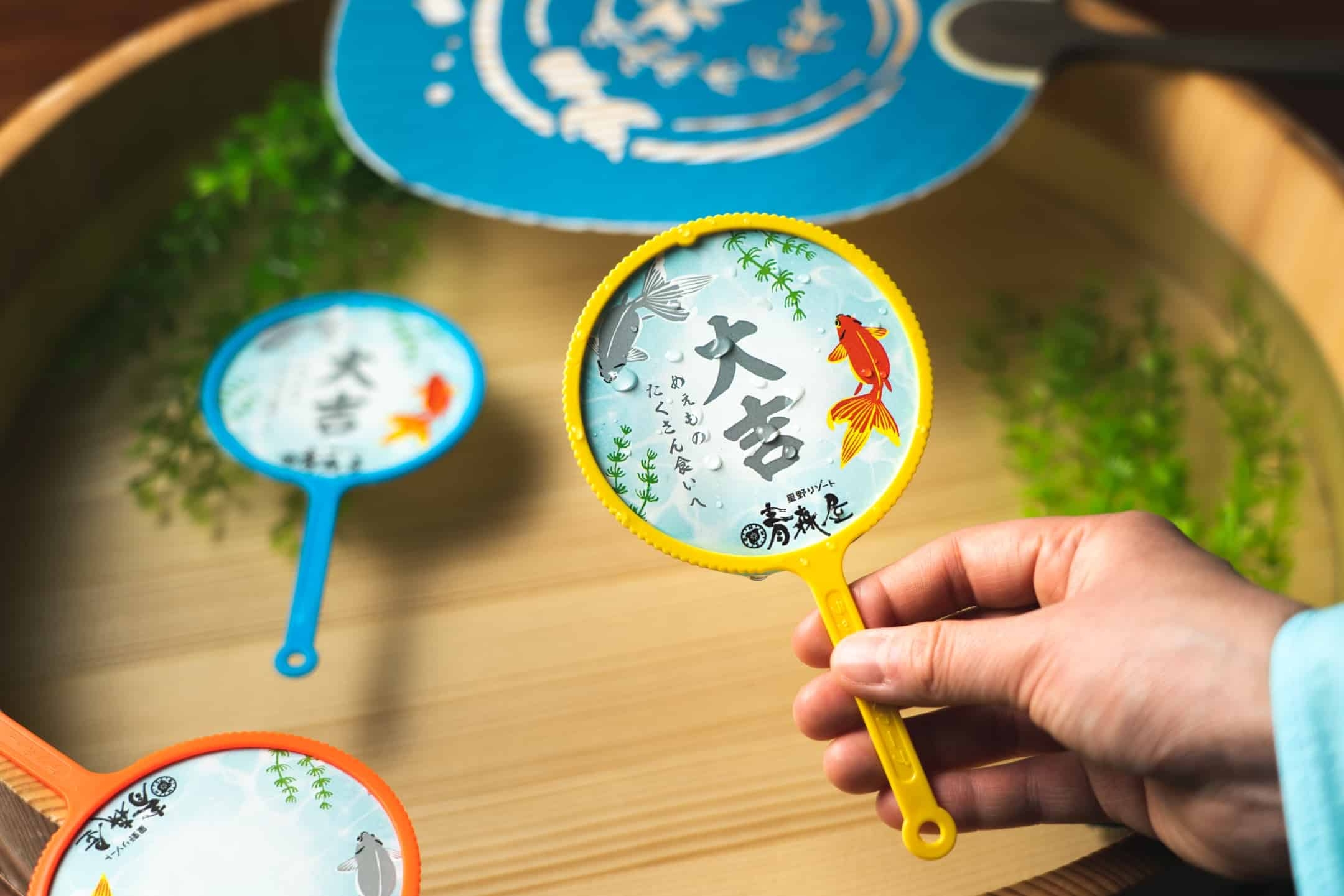 大きな金魚ねぷたを屋根に設えた金魚すくいの屋台です。金魚が入った木桶から金魚をすくいます。すくった金魚は、客室まで持ち帰り鑑賞することができます。