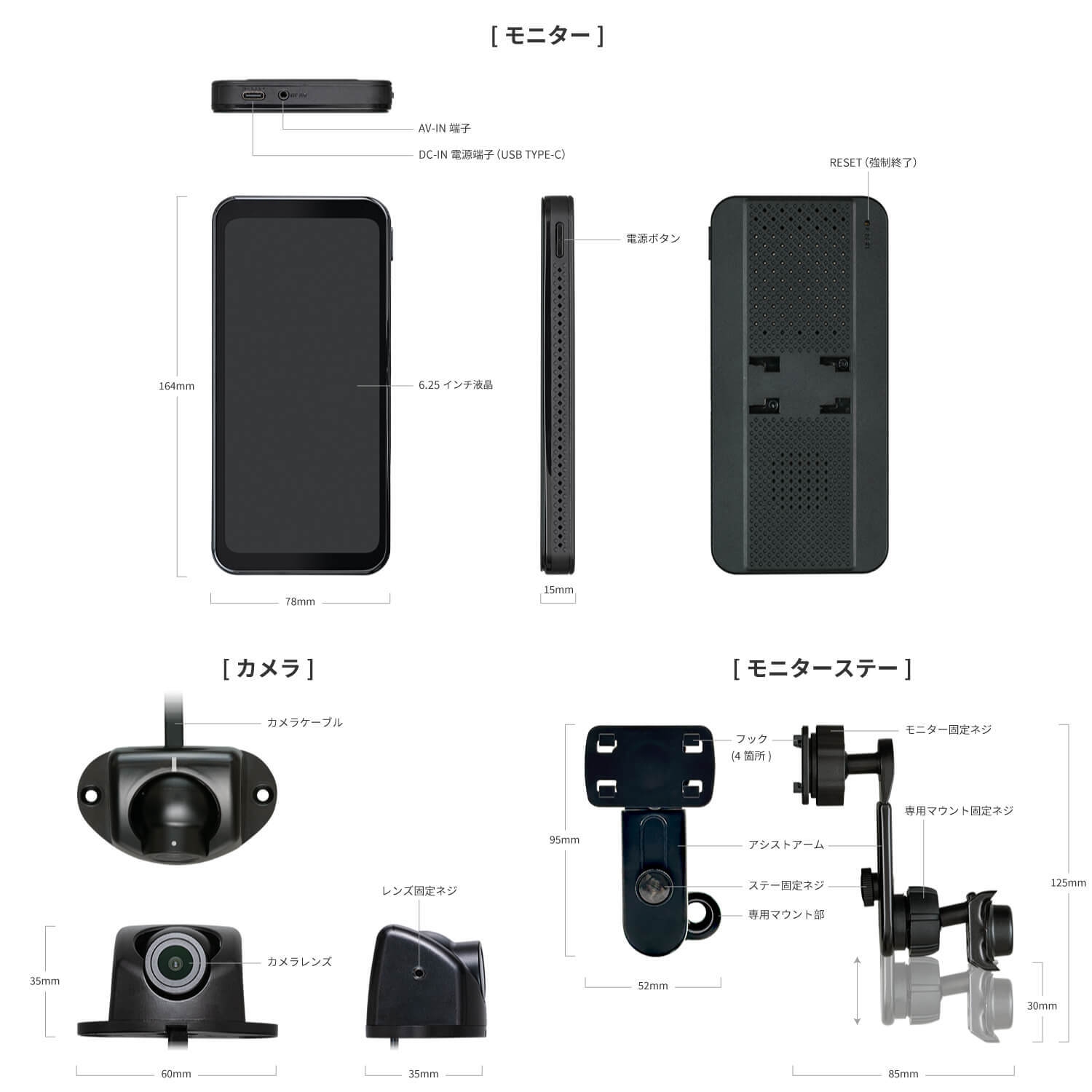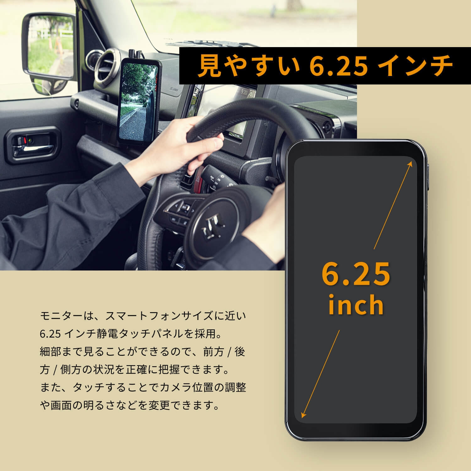 ●モニターはスマホサイズの6.25インチ液晶(112万画素)を採用することで色彩や路面の障害物もはっきり細部まで見ることができ、前方/後方/側方の状況を正確に把握できます。