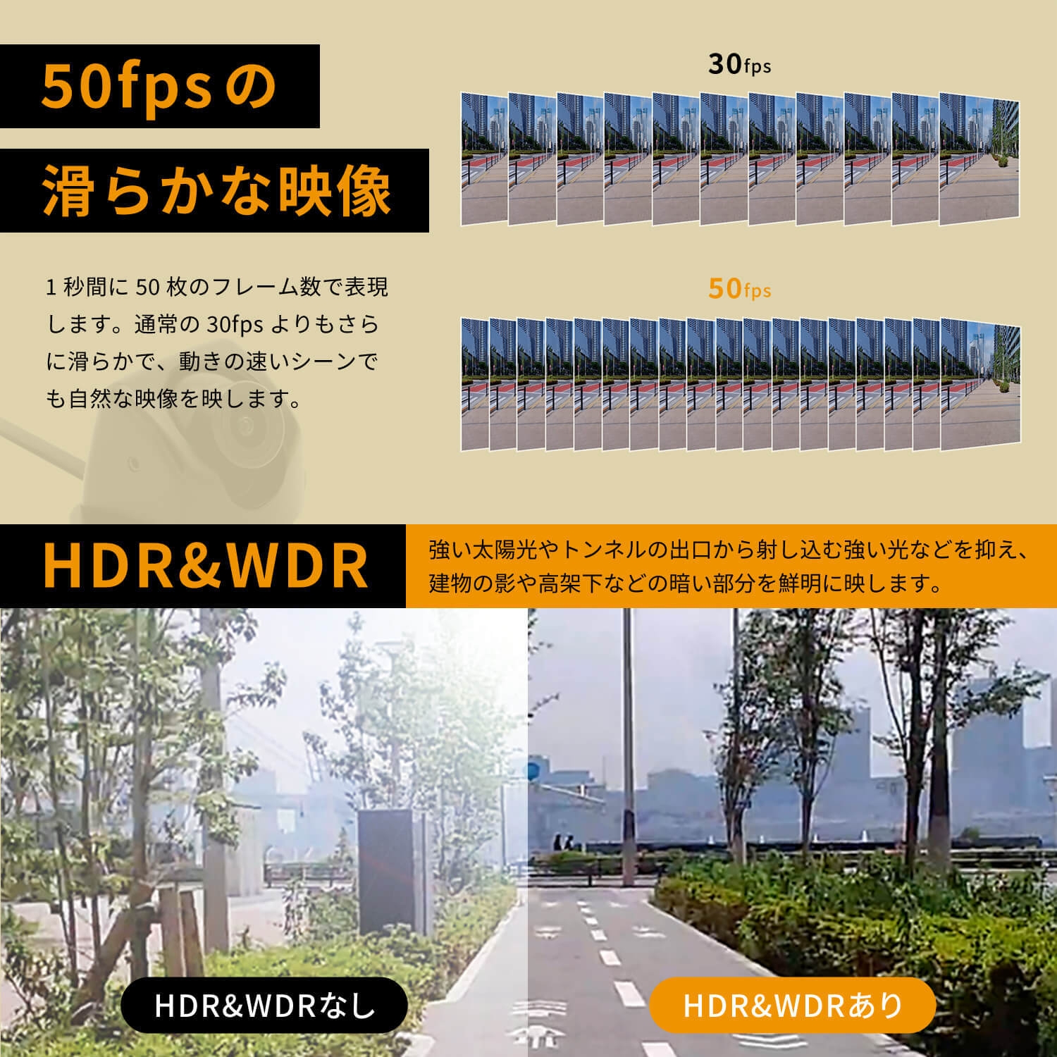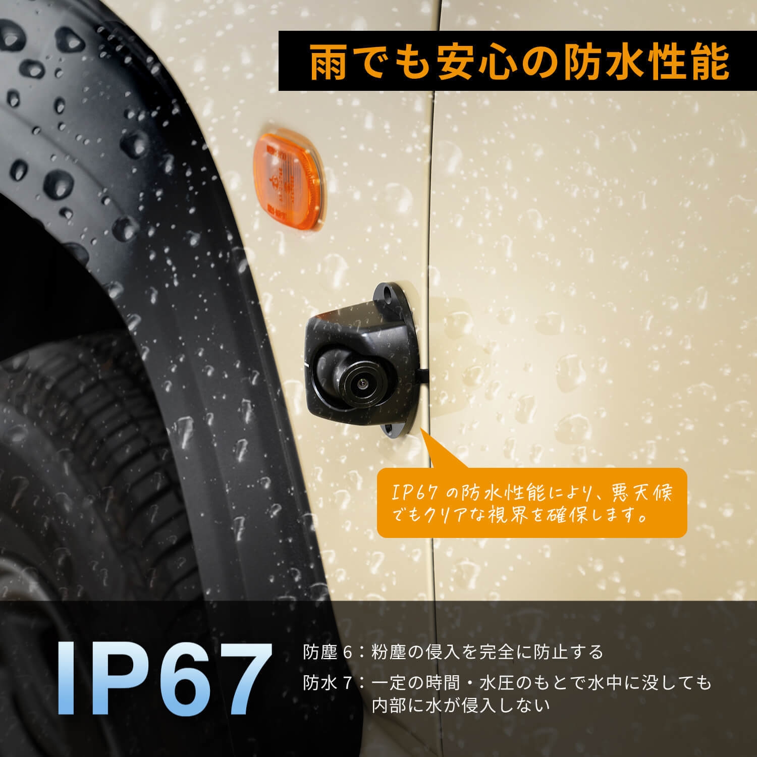 ●カメラのレンズを角度調整する事で、撮影角度の微調整ができます。滑らかな映像を実現した高フレームチューニング(50fps)で確認できます。雨にも強いIP67防水仕様です。