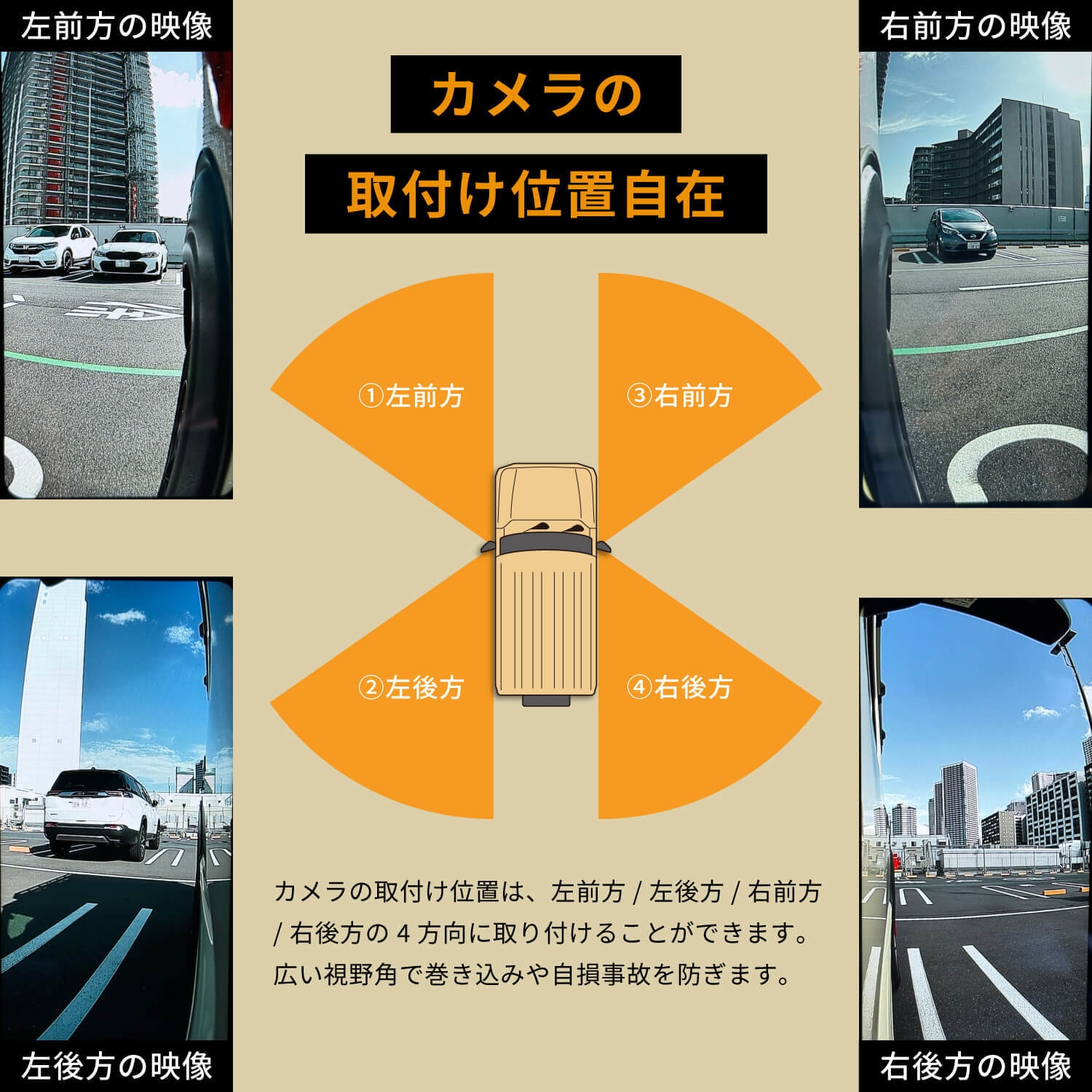 ●カメラの取付け位置は、左前方/左後方/右前方/右後方の4方向に取付けることができ、ソフトウェアで画面の向きを切り替えできます。