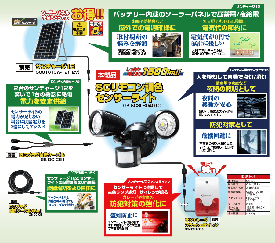 AC100Vタイプと災害時でも給電可能なバッテリー付きソーラーパネル「サンチャージ12」用DC12Vタイプの2種類展開となります。
