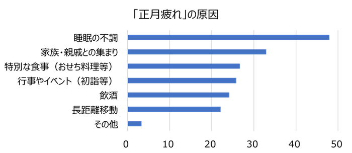 「寝正月」という言葉があるように、正月休みには普段以上にゆっくりと寝て過ごしている方も多いかもしれません。しかし、正月明けに「疲れがあった」と答えた方240人に「疲れの原因はなんだと思いますか?」と尋ねたところ、「睡眠の不調」と答えた方が47.9%と、意外なことに他の原因に比べ「睡眠の不調」が目立つ結果となりました。では、なぜ正月明けに睡眠の不調を自覚するのでしょうか。