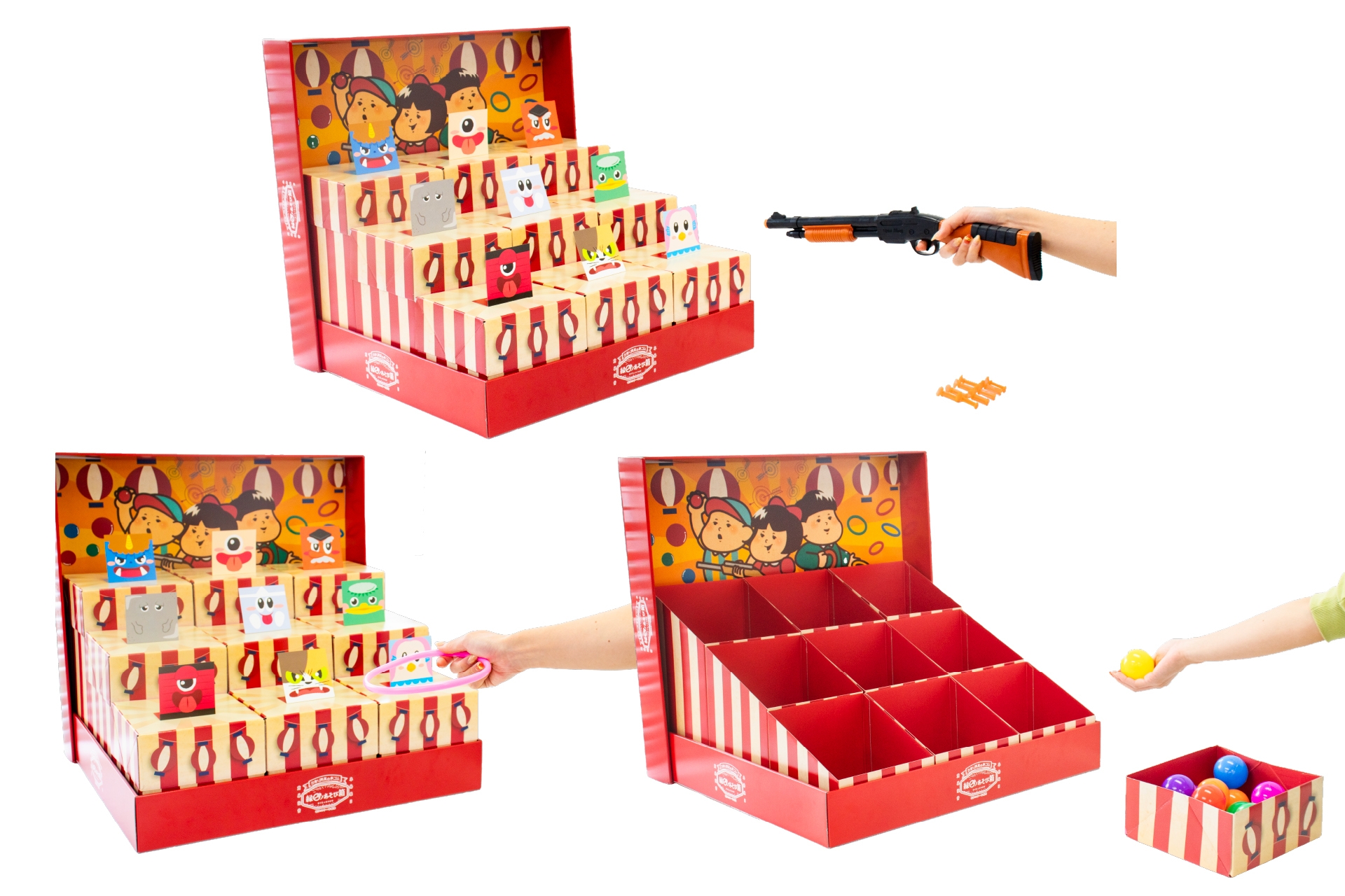本商品は、射的・わなげ・玉入れに必要な備品と景品がすべてセットになった“持ち運べる縁日会場”。組み立てるだけですぐに遊べ、あそび終わったあとはコンパクトに収納可能。イベント会場・地域の集まり・ご家庭など、どこでも手軽に縁日あそびを楽しめます。