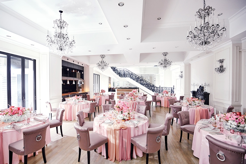 斬新的なデザインで、驚き、面白さ、興奮といった刺激によって形成されています。最高級の映像設備が完備されており、3連のハイスペックスクリーンで3つの動画を同時再生することにより、壁面一面に圧巻の動画上映が可能です。音響機材はBOSE社を採用し、披露宴会場とは思えないほどの高品質音源が響き渡ります。6m吹き抜けの空間には、アート要素の詰まった大理石の階段。ラウンジスペースには、スワロフスキーがあしらわれたシャンデリアがゲストをお出迎えいたします。