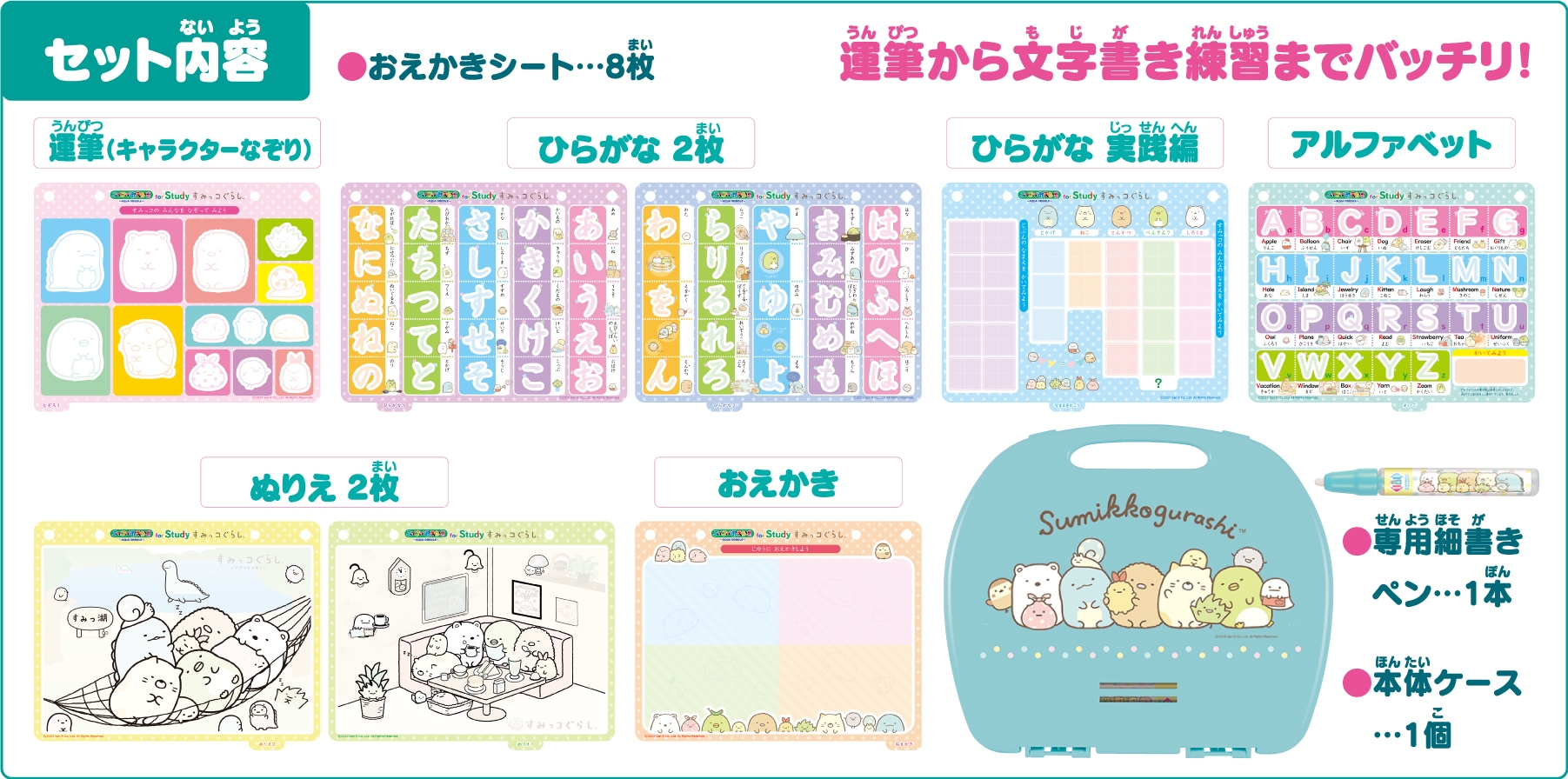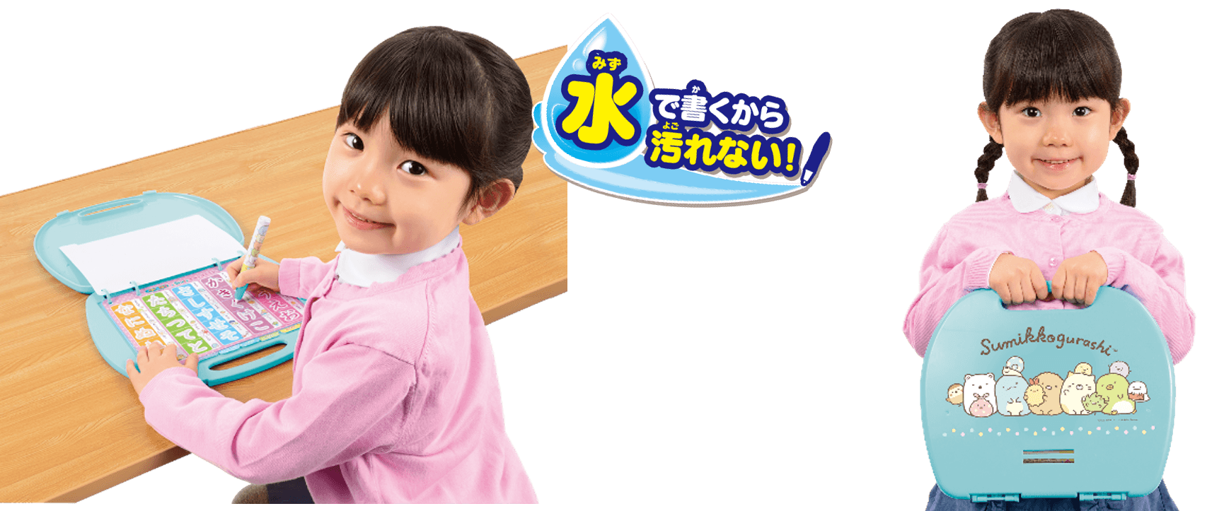 「スイスイおえかき for Study」から人気キャラクター「すみっコぐらし」のデザインを使用した「はじめてのお勉強バッグ~楽しく入学準備~ひらがな・ABC・おえかき・ぬりえ」が新しく登場。専用の細書きペンに水道水を入れて準備完了。ひらがな・カタカナ・すうじ・ABCのれんしゅうボードをなぞってお勉強ができます。水で書くので、服や手を汚すことがなく、乾かせば何回でも練習できます。持ち運ぶこともできるので、どこでもお手軽にお勉強ができます。