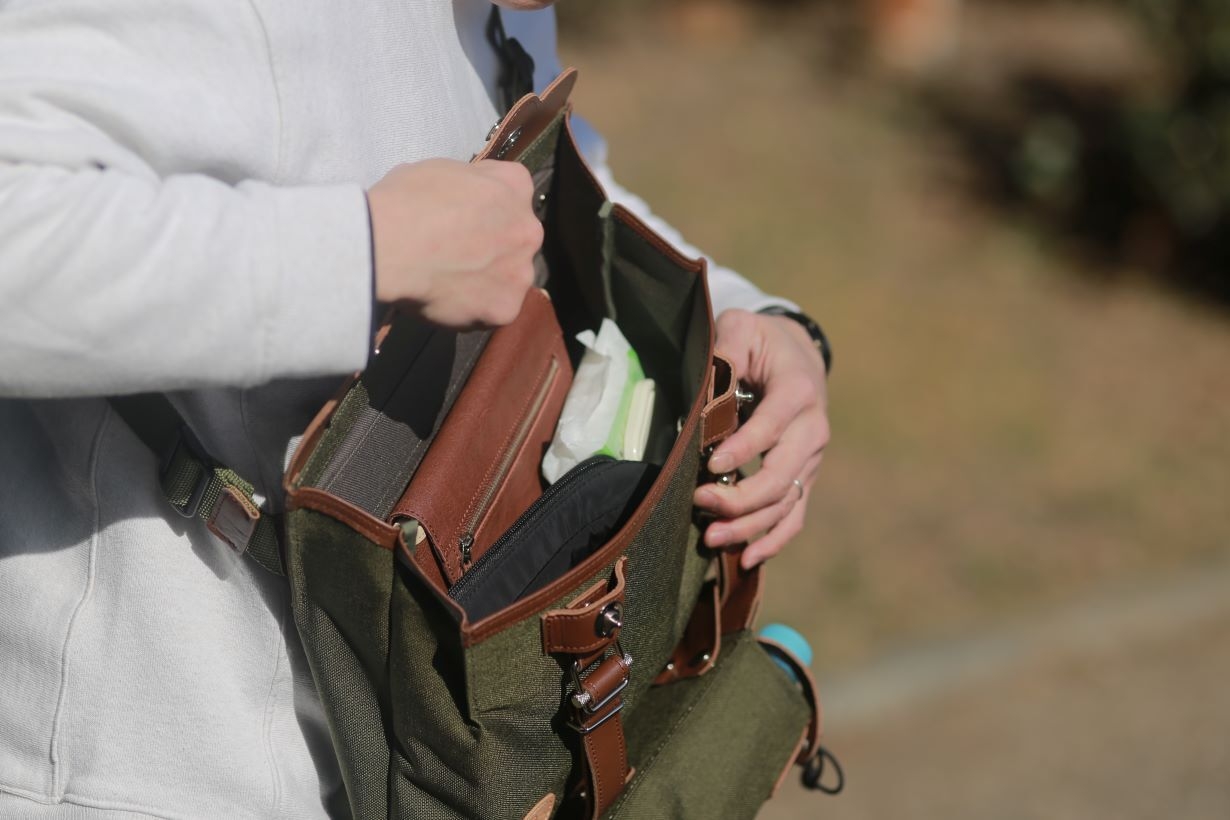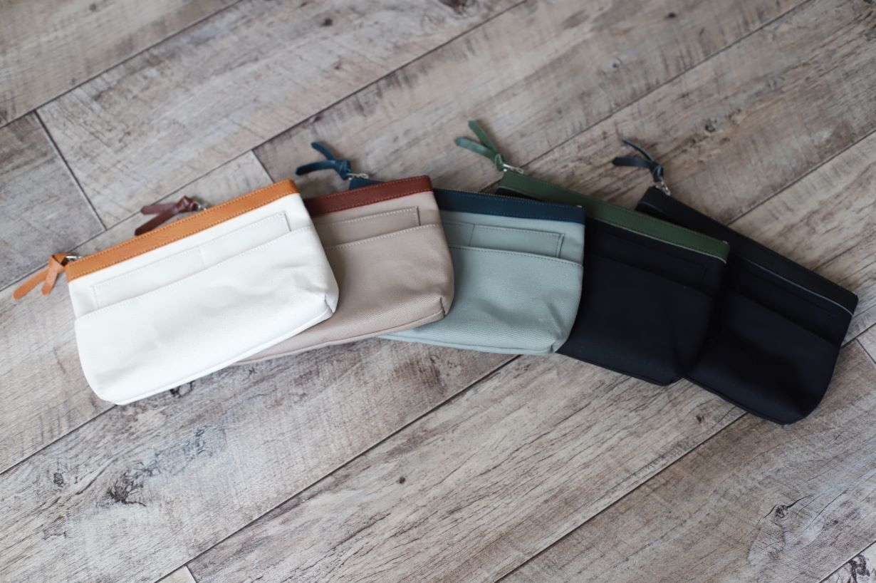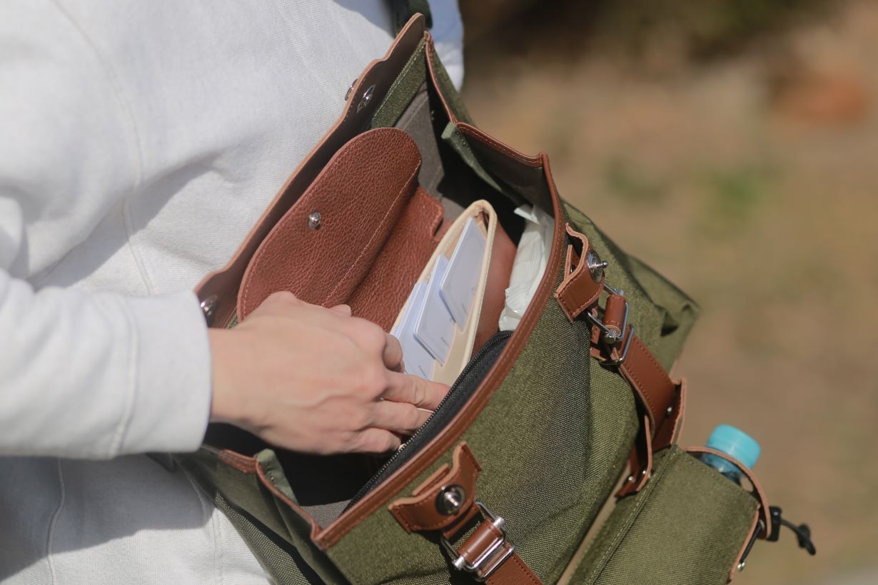 大きく開いて中身が見渡せる利便性はそのままに、体にフィットして持ち運びやすく、移動がしやすいスリングバッグ(ボディバッグ)にしました。