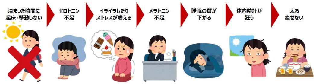 日光を浴びる機会の減少やコロナ禍のストレスにより、セロトニンの分泌量が減少すると、間食が増える、甘いものが欲しくなる、暴飲暴食になるなど、ますますカロリー過多になってしまいます。