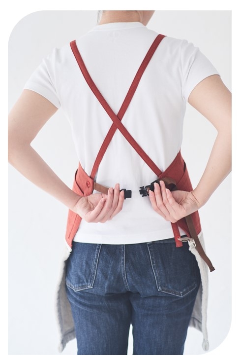 エプロン部分の生地には撥水加工を施したリネン、コットン混合素材を使用し、ナチュラルでありながら 上質な風合いに仕立てています。肩ひもは、首や肩に負担をかけにくいクロスデザインで、3つのボタンで 長さ調整が可能。また、腰ひもにはバックルを採用し、着脱のしやすさにもこだわりました。機能性だけではなく、着用した際の快適さや美しいシルエットまでも追及した、和田さんのこだわりや思いのつまったエプロンです。