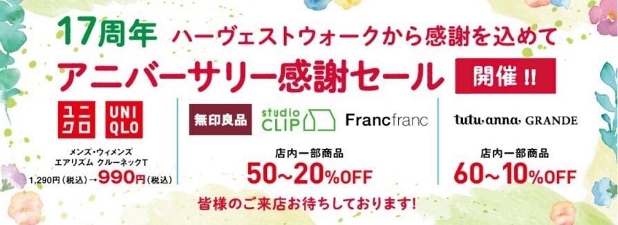 2024年4月26日(金)~5月6日(月・祝)の11日間、セール開催いたします。その他多数の店舗でお得なセールを開催いたしますので、皆様のご来店をお待ちしております。