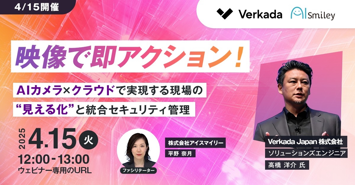 AIポータルメディア『AIsmiley』を運営する株式会社アイスマイリー(東京都渋谷区、代表取締役:板羽晃司)は、2025年4月15日(火)12時からAIカメラ×クラウド活用をテーマにウェビナーを開催します。