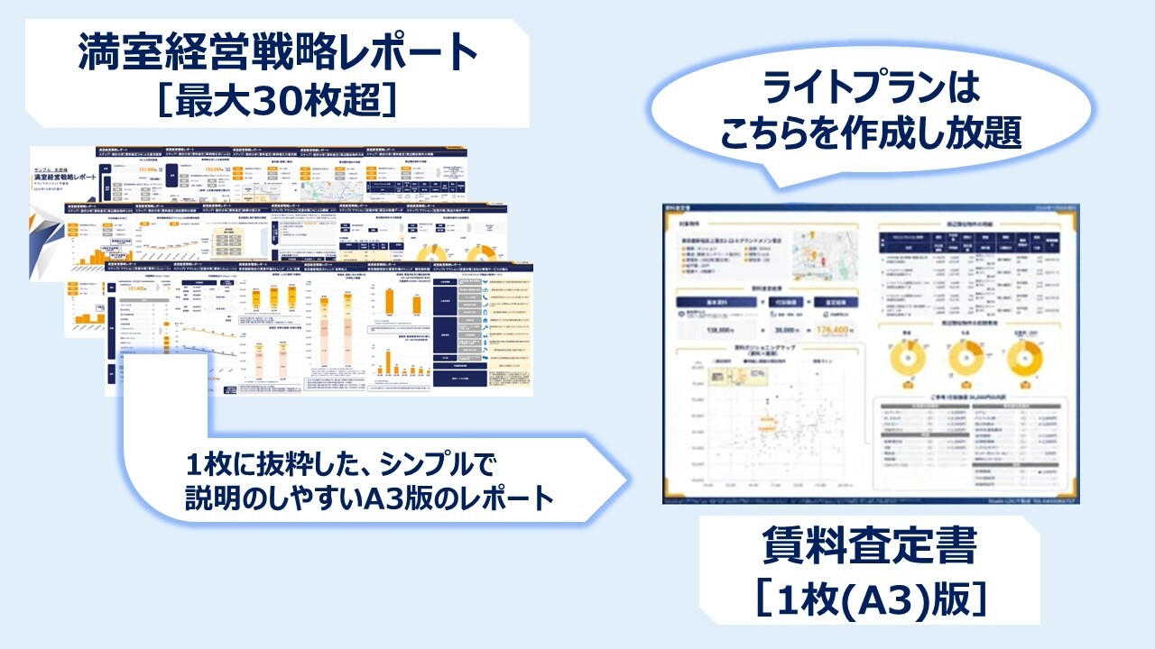 「ライトプラン」では、高精度なAI賃料査定がし放題であり、かつ、オーナーに合理的に査定結果を説明しやすいシンプルな賃料査定書(1枚(A3)版)を回数制限なく出力することができるため、不動産会社は、使用回数や費用を気にせずに、オーナーへの提案量や質を大きく高めることができます。