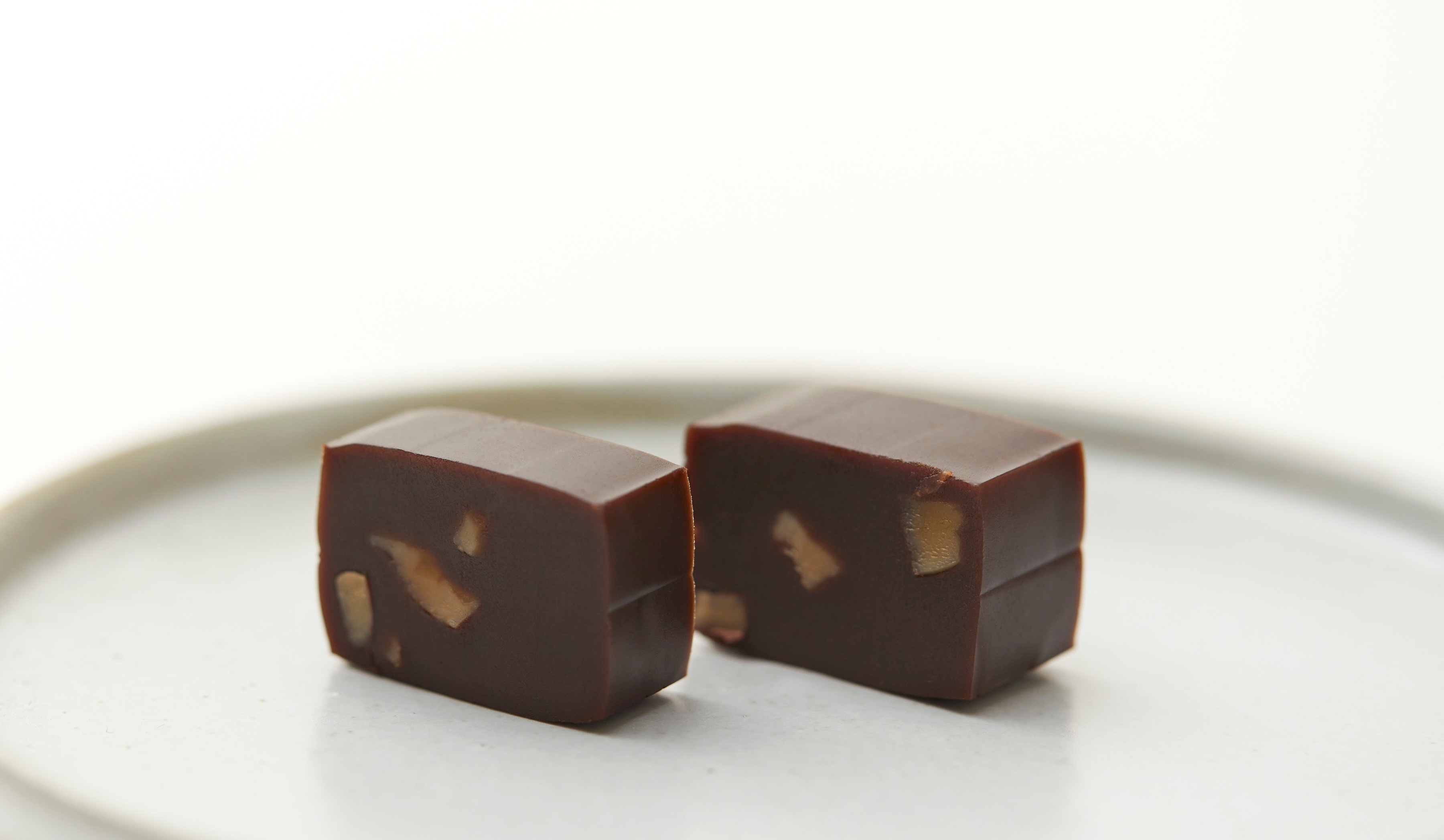 チョコレートは口に入れた瞬間にカカオの風味をしっかりと感じることができるよう、カカオ成分99%のクーベルチュールチョコレートを使用。そこにクラッシュアーモンドをふんだんに入れたことで、ナッツの香ばしさと歯応えがアクセントとなった食感もお楽しみいただける羊羹です。