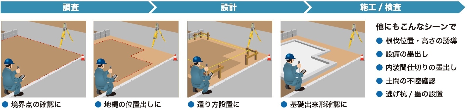 また、正確な位置出しが困難な高低差のある現場でも、高精度な位置出しが可能です。測量外注費用の削減にも貢献します。
