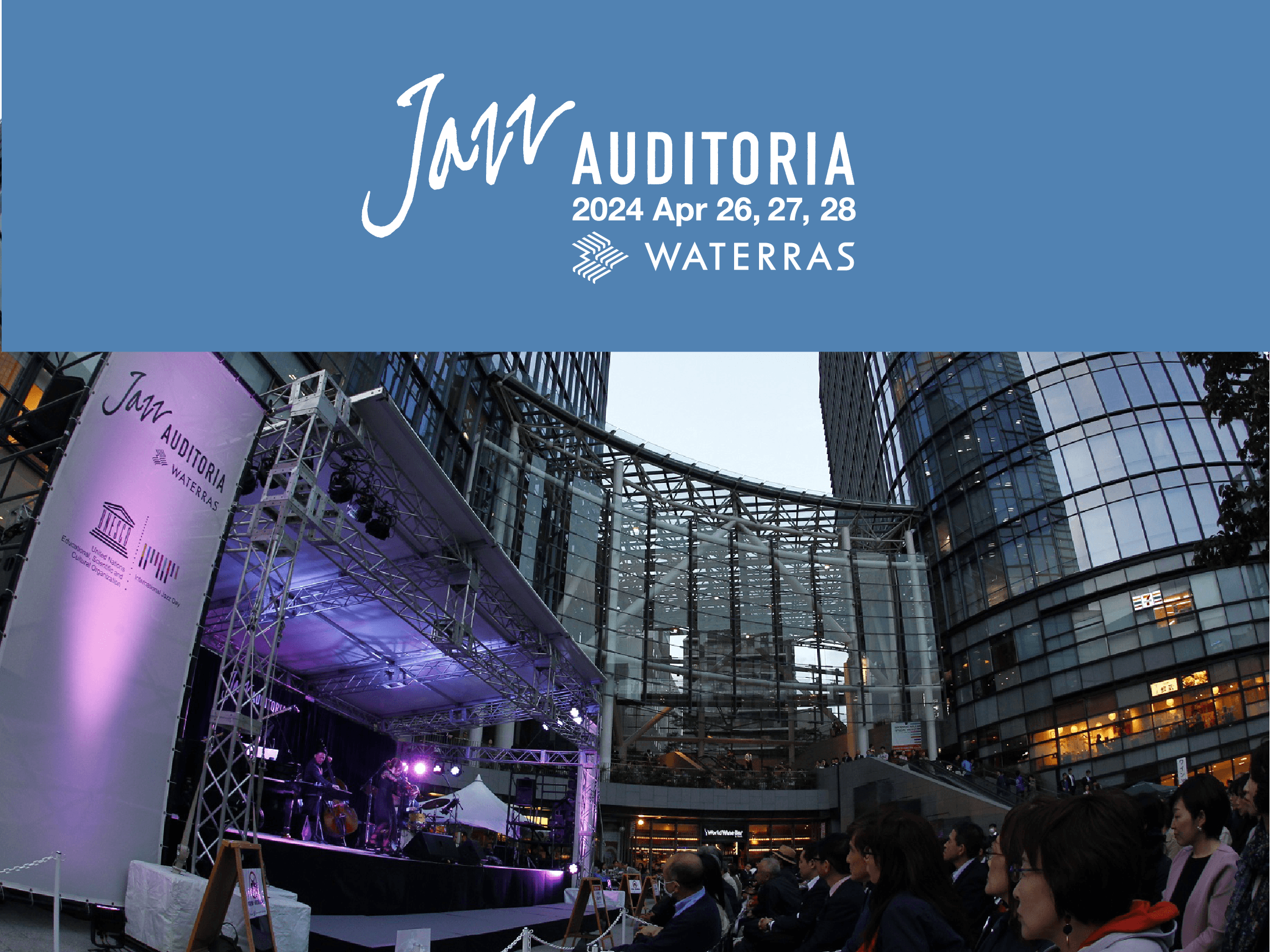 神田淡路町のまちづくりを担う一般社団法人淡路エリアマネジメントが携わる東京・神田の複合施設・ワテラス(WATERRAS)を舞台に『JAZZ AUDITORIA 2024 in WATERRAS』として2019年以来、5年振りの野外開催が決定いたしました!