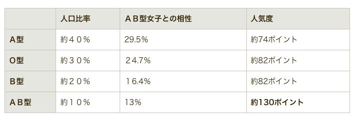 今回のアンケート結果を血液型ごとの人口比率と比較し、人気度を算出したのが上記のグラフです。人気度では1位がAB型(約130ポイント)、2位は同率でO型とB型(約82ポイント)、4位はA型(約74ポイント)と、ランキングと逆転する形になりました。