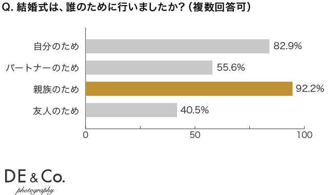 結婚式は家族や友人と特別な瞬間を共有する手段、ウェディングフォトはおふたりで楽しむ手段。 結婚式は多くの人が「親族」(92.2%)や「自分のため」(82.9%)に行なっていることがわかります。一方でウェディングフォトは、「自分のため」(92.7%)に行うケースが圧倒的に多い結果となりました。一般的に結婚式は家族や友人と特別な瞬間を共有する手段、ウェディングフォトはおふたりで楽しむために行われる傾向が明らかとなりました。