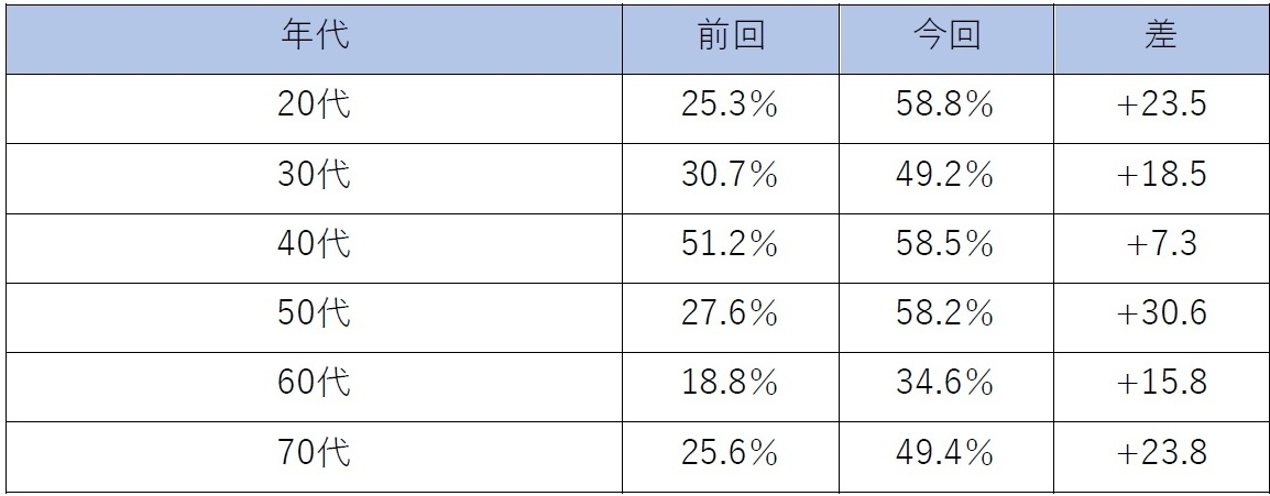 なかでも20代が53.9%と最も高く、全世代の中で唯一50%を超える結果となりました。前回の調査でも20代は48%と高い数字でしたが、さらに5.9ポイント増加しました。20代は「FIRE」への関心も高い世代であり、自分で資産を作ることに対しての意識が高く、インフレに対する動きも積極的なのだと考えられます。