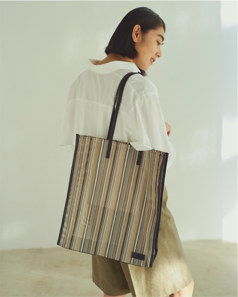 軽やかで涼やかなメッシュ素材のトートバッグ。ハリのある素材が、しっかりと”四角”をキープし、コーディネート全体をキリッと引き締めます。また、縦長、かつきっぱりとした存在感を放つ大きさは、モードなムードを醸します。