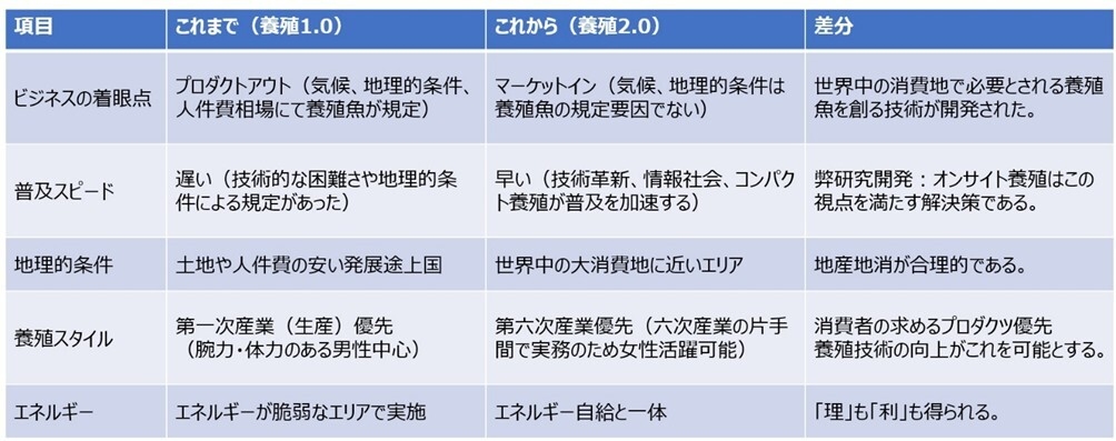 今後は消費地が養殖地を決定し、多極分散型の養殖が世界的に広く普及する時代になると当社は考えています。地産地消(オンサイト養殖)が可能となり、消費者は、活(Live)、生(Fresh)の魚が入手可能となります。養殖産業が地域の雇用を産み、消費者の支出は域内に留まり、循環します。遊休施設が利活用され、地方都市に活気が出ます。食料自給率が向上し、食料安全保障が保たれる社会。当社はこの養殖新世代を養殖2.0と定義し、養殖産業の成長に貢献することを宣言いたします。