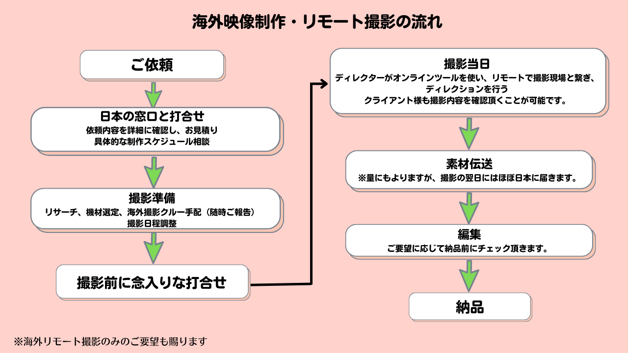 ※制作をまるまる弊社で請け負わず、現地のリモート撮影のコーディネートのみのご依頼にも対応しております。