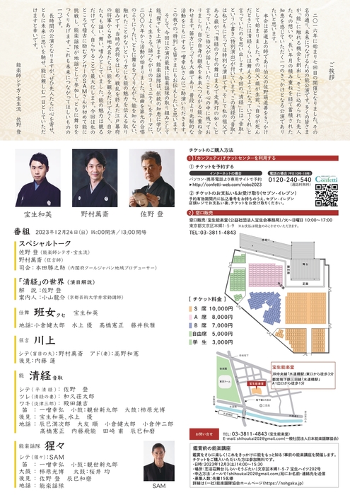佐野 登 一般社団法人日本能楽謡隊協会主催、「未来につながる伝統」能公演が2023年12月24日 (日)に宝生能楽堂(東京都文京区本郷1-5-9)にて上演されます。