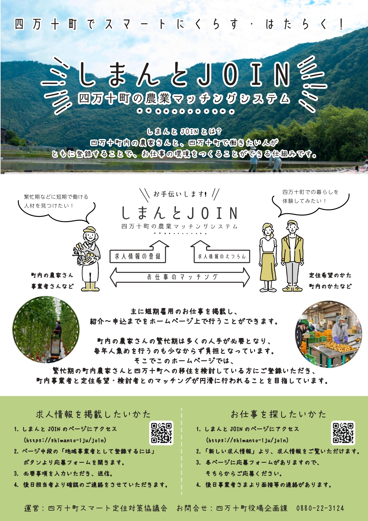 『しまんとJOIN』は、四万十町内の農家さんを中心に、繁忙期などで人手を必要としている町内事業者さんと、四万十町で農業の仕事がしたい方を紹介することができるシステムです。
